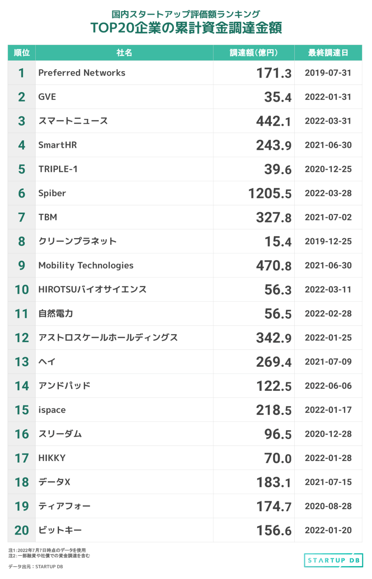 先月から変化があったのは、新規ランクインを果たしたアンドパッドだ。累計資金調達金額は122億5,000万円に達しており、登記簿から今年に入って約38億9,200万円の調達を確認している。ランクイン企業のうち、累計資金調達金額が100億円以上の企業は13社。トップは1,205億円のSpiberで、Mobility Technologiesの470億円、スマートニュースの442億円がこれに続く。また、評価額が1,000億円を超える11社の中では、半数以上の6社が100億円以上を調達していることがわかる。