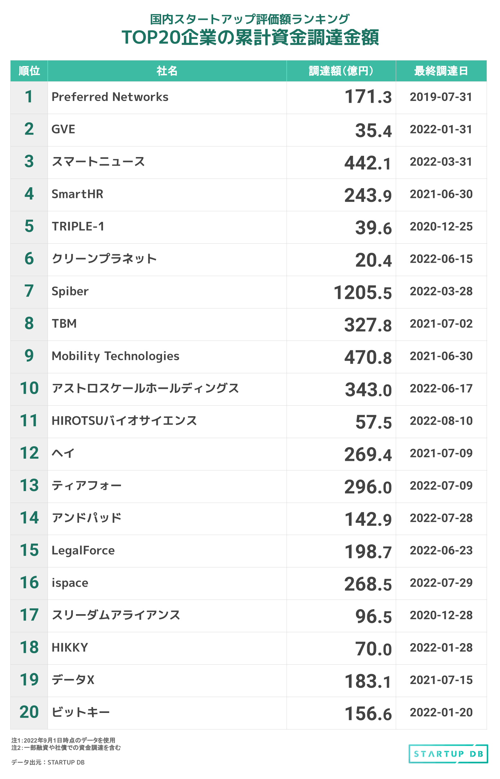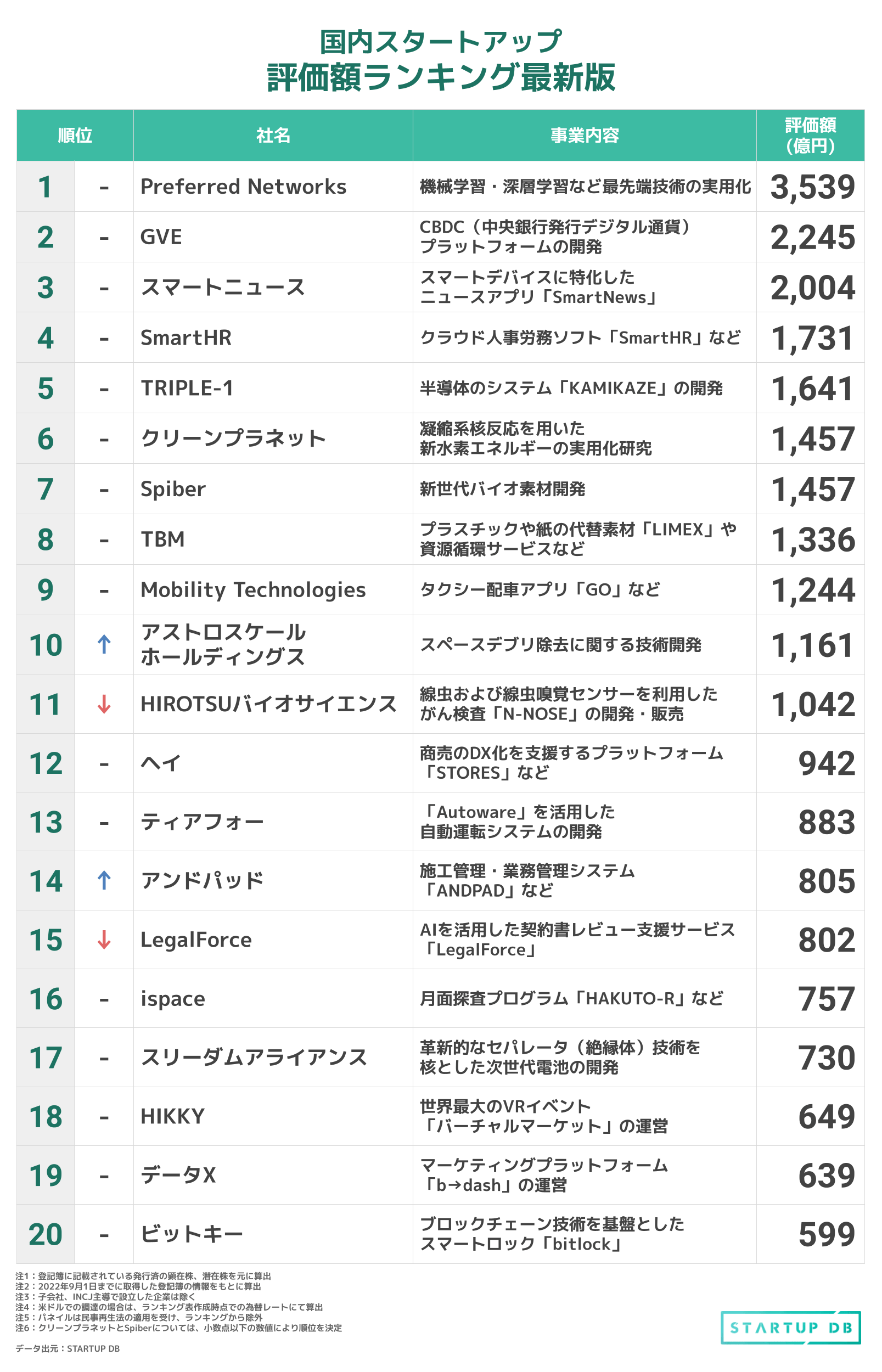 アストロスケールホールディングスとアンドパッドの順位が上昇、上位20社の顔ぶれに変化なし