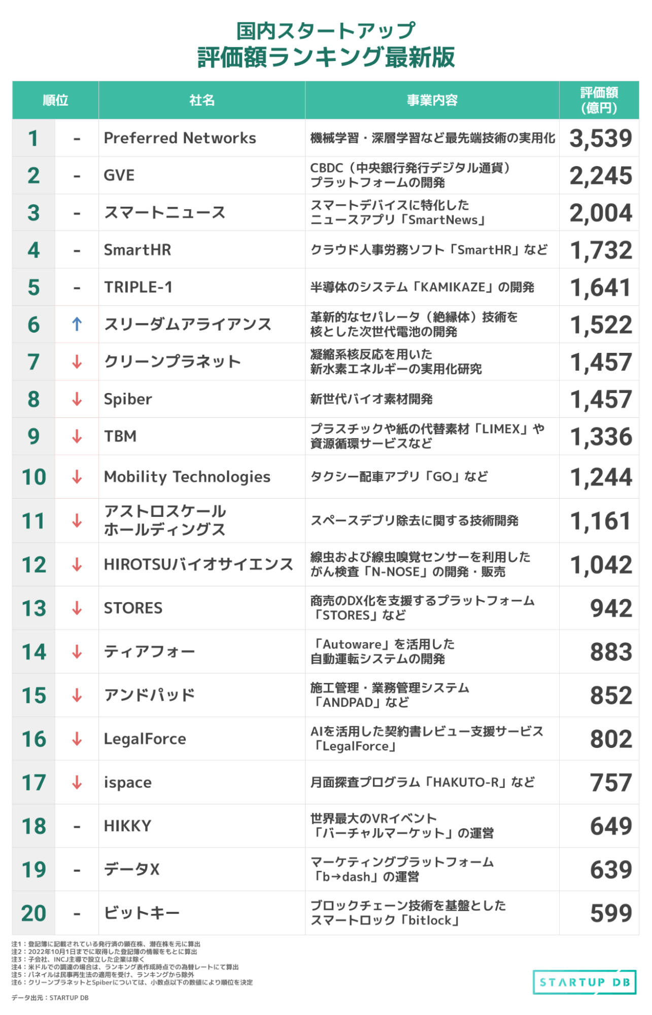 今月の評価額ランキングでは、上位20社の顔ぶれに変化はなかったものの、スリーダムアライアンスの評価額が800億円弱増加し、順位を先月の17位から6位に上げている。スリーダムアライアンスは、革新的なセパレータ(絶縁体)技術を核とした次世代電池の開発・提供するスタートアップ。2022年10月時点の評価額は1,522億円で、先月の730億円と比較して792億円増加し、ランキング6位に浮上している。2022年4月における15億円の資金調達を同社の登記簿より察知したことが、評価額の増加につながった。また、クラウド型建設プロジェクト管理アプリ「ANDPAD」を提供するアンドパッドは7月末から9月初めにかけての複数回の資金調達を登記簿より確認し、評価額が先月より47億円増加している。その他、SmartHRが新しく新株予約権を発行したことが登記簿より判明し、評価額が約1億円増加している。