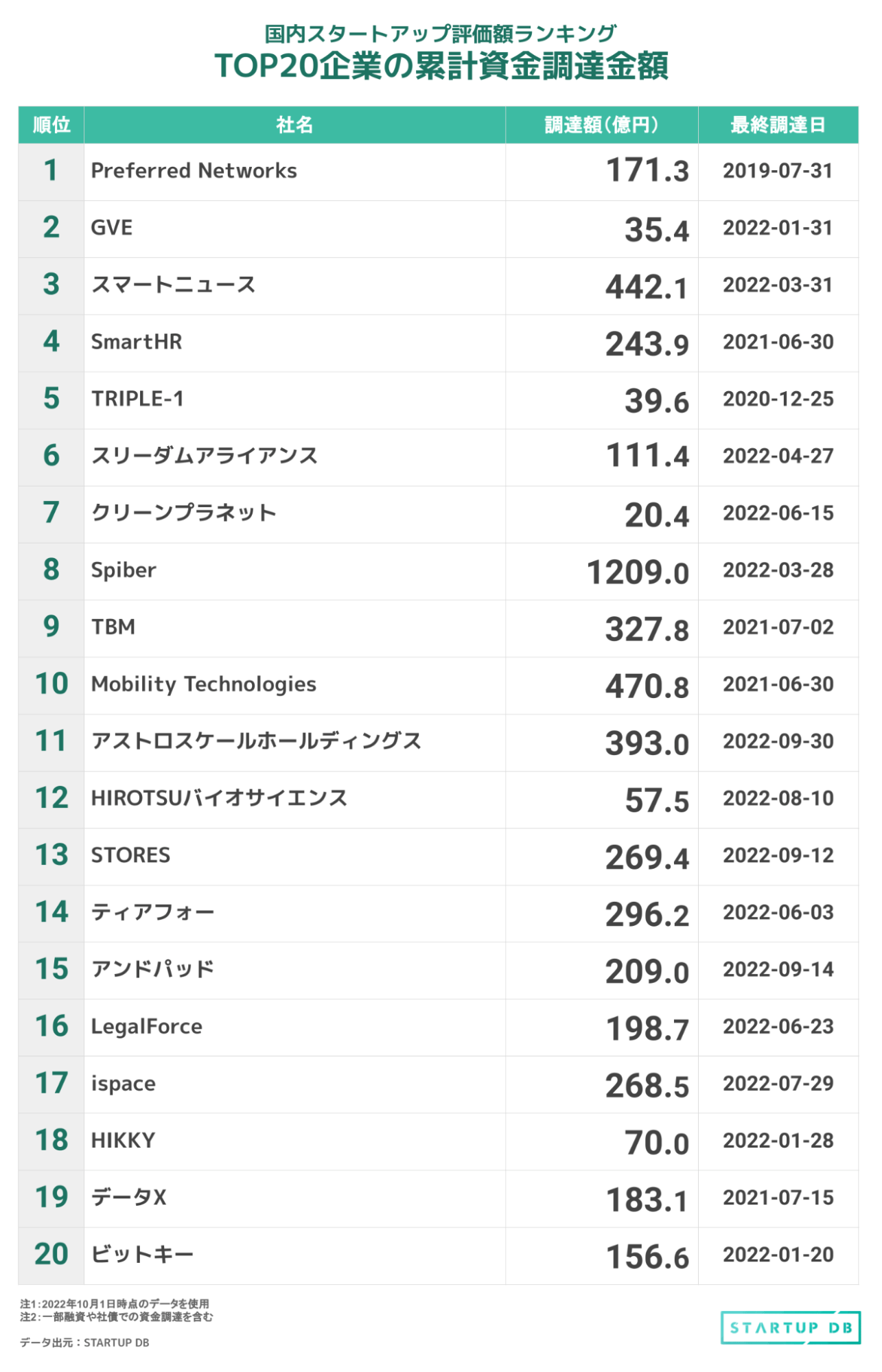 累計資金調達金額が先月から変化した企業は、スリーダムアライアンス、アストロスケールホールディングス、ティアフォー、アンドパッドの4社である。アストロスケールホールディングスは、中小企業基盤整備機構による革新的技術研究成果活用事業円滑化債務保証制度を活用し、9月に三菱UFJ銀行との50億円の融資契約を締結。今後は、スペースサステナビリティに関する意識の高まりに合わせて増加するサービス需要に応え、開発を加速していく方針だ。ティアフォーは、7月におけるSOMPOホールディングス、ヤマハ発動機、ブリヂストンからの121億円の資金調達が登記簿情報に反映されたことにより、累計資金調達金額に微小な変化が生じている。アンドパッドは9月に海外機関投資家を中心とした総額約122億円のシリーズDラウンドの資金調達を公表。Minerva Growth Partnersをリードとする第三者割当増資および、三菱UFJ銀行と商工組合中央金庫からの融資を受けている。今後の戦略的な投資領域に関する基本方針を“ANDPAD Second Act”と位置付け、6つの戦略的投資を推進するとともに、建設業界全体の課題解決を目指していく。