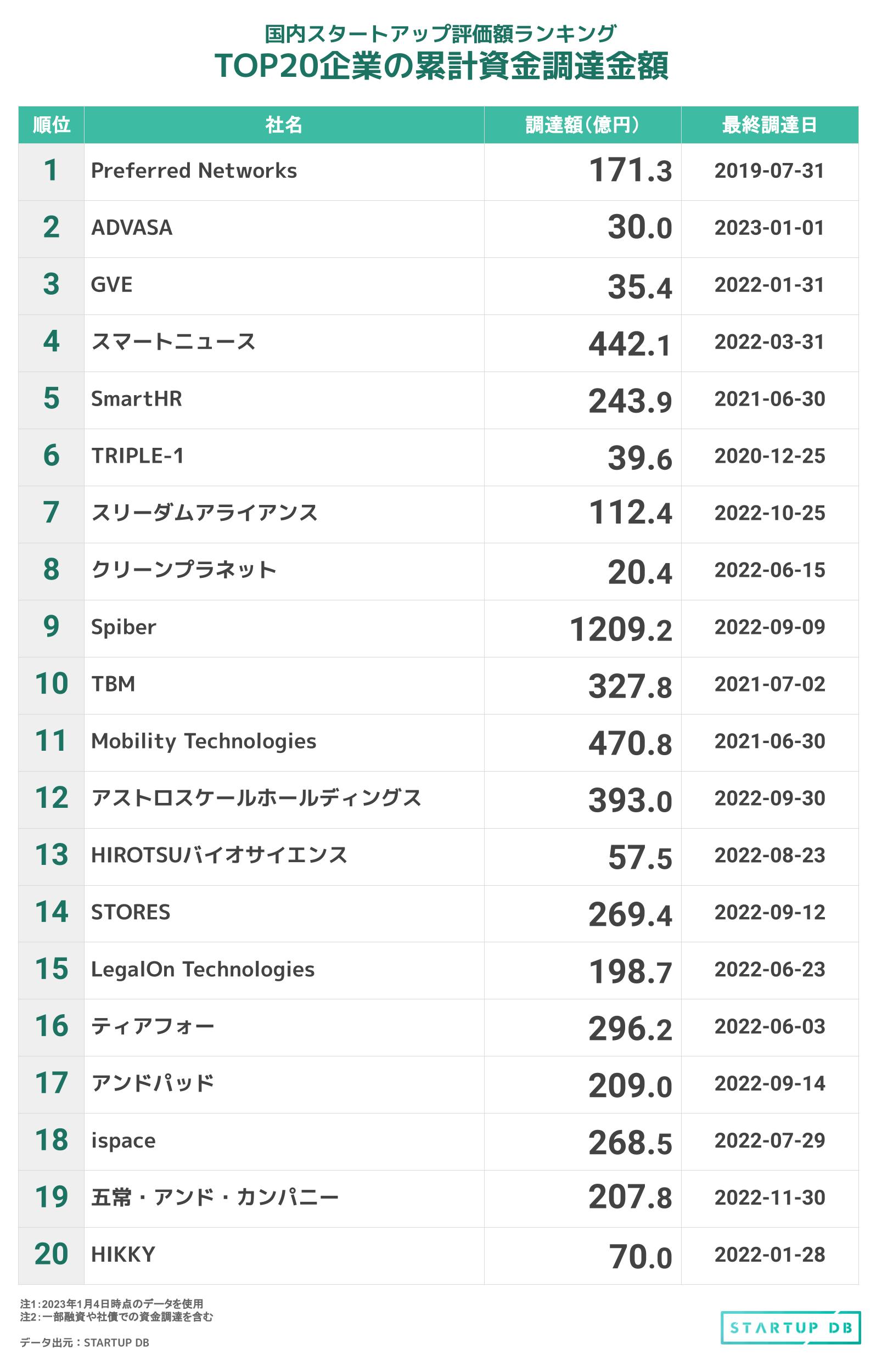 ランク圏外だったADVASAが、2023年1月時点で評価額2位に躍り出た。同社は1月6日、評価額2,000億円で資金調達を実施したと発表。STARTUP DBの調査では2,301億円となっている。調達額や出資元などは公表していない。