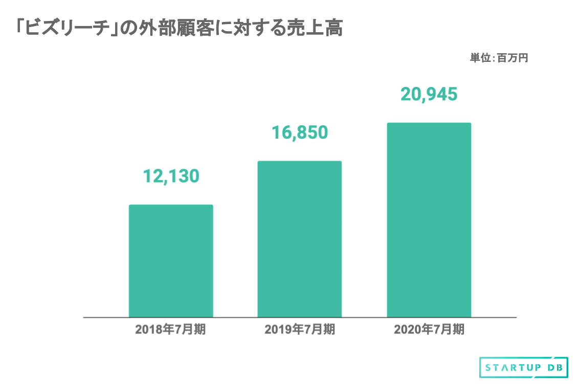図から、「ビズリーチ」の売上高は2018年7月期から2019年7月期にかけて約1.4倍、2019年7月期から2020年7月期にかけては約1.2倍と、着実な増加を見せている。