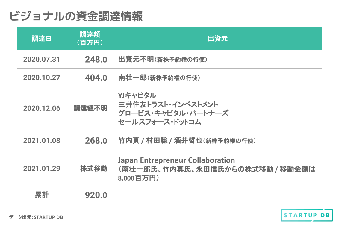 ビジョナルは、これまで4回の資金調達を実施し、累計で9億2,090万円を調達していることがわかる。