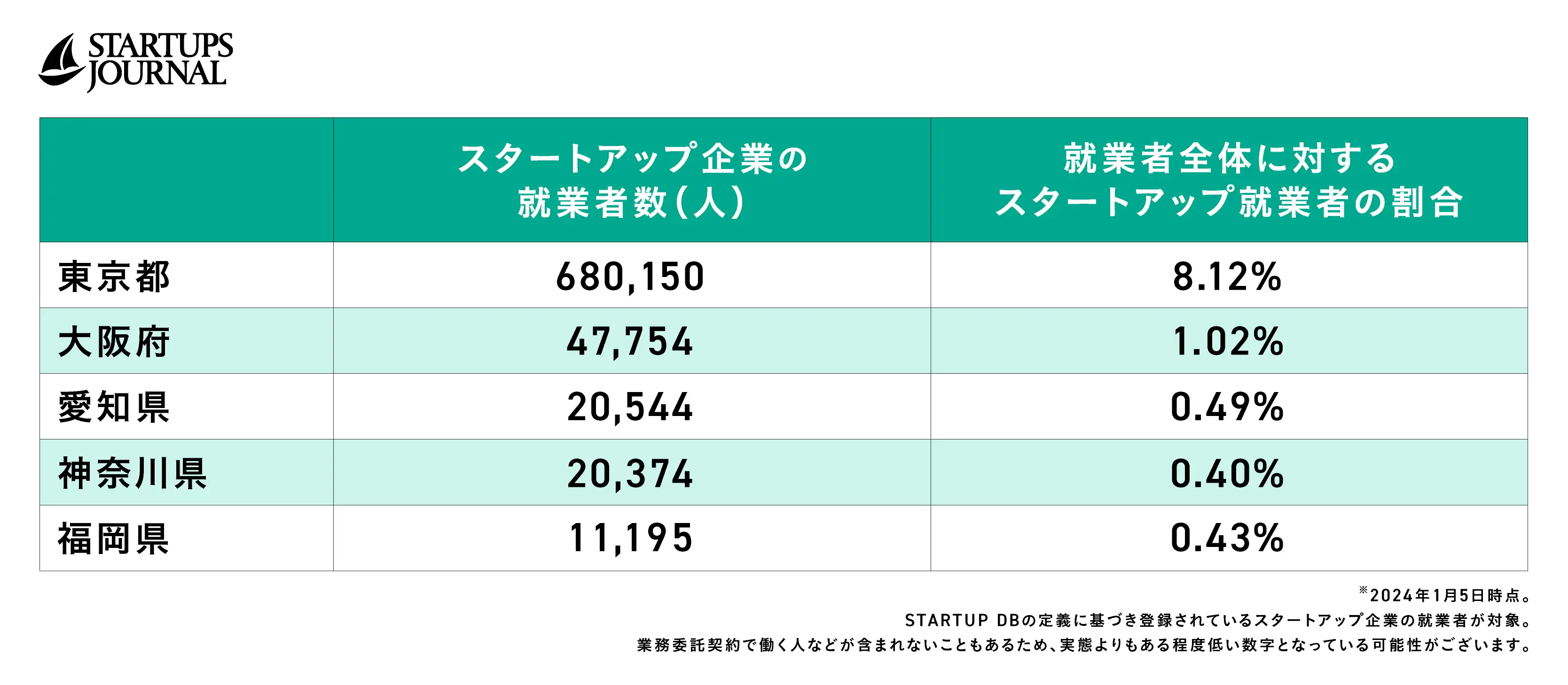 労働力調査などの総務省の統計とSTARTUP DBの独自データを掛け合わせ、2024年1月5日時点でのスタートアップ人口を都道府県別で調べてみた。