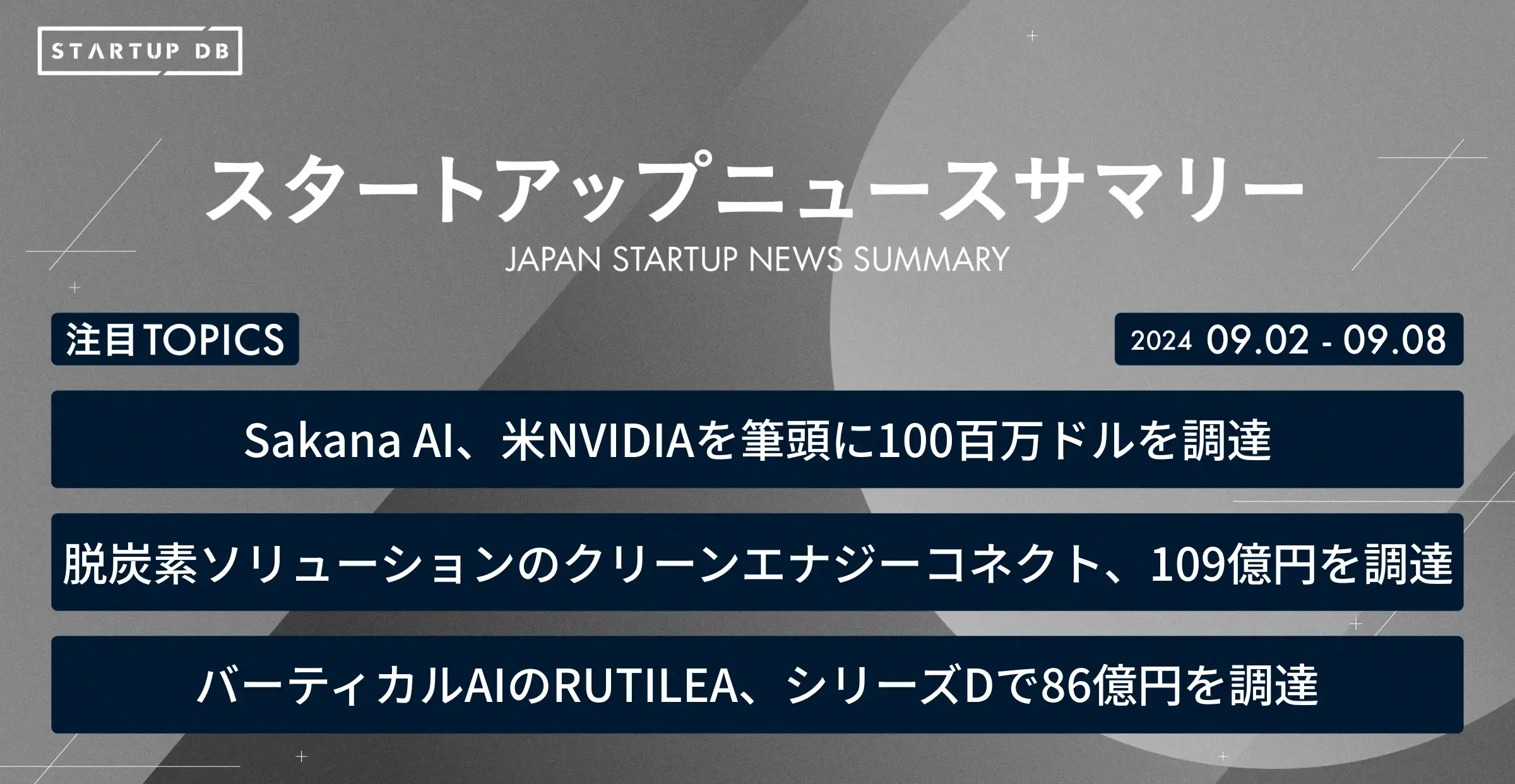 国内の成長産業やスタートアップに関する幅広い情報を収集・整理し、検索可能にした情報プラットフォーム「STARTUP DB」では毎週、スタートアップニュースサマリーを配信している。