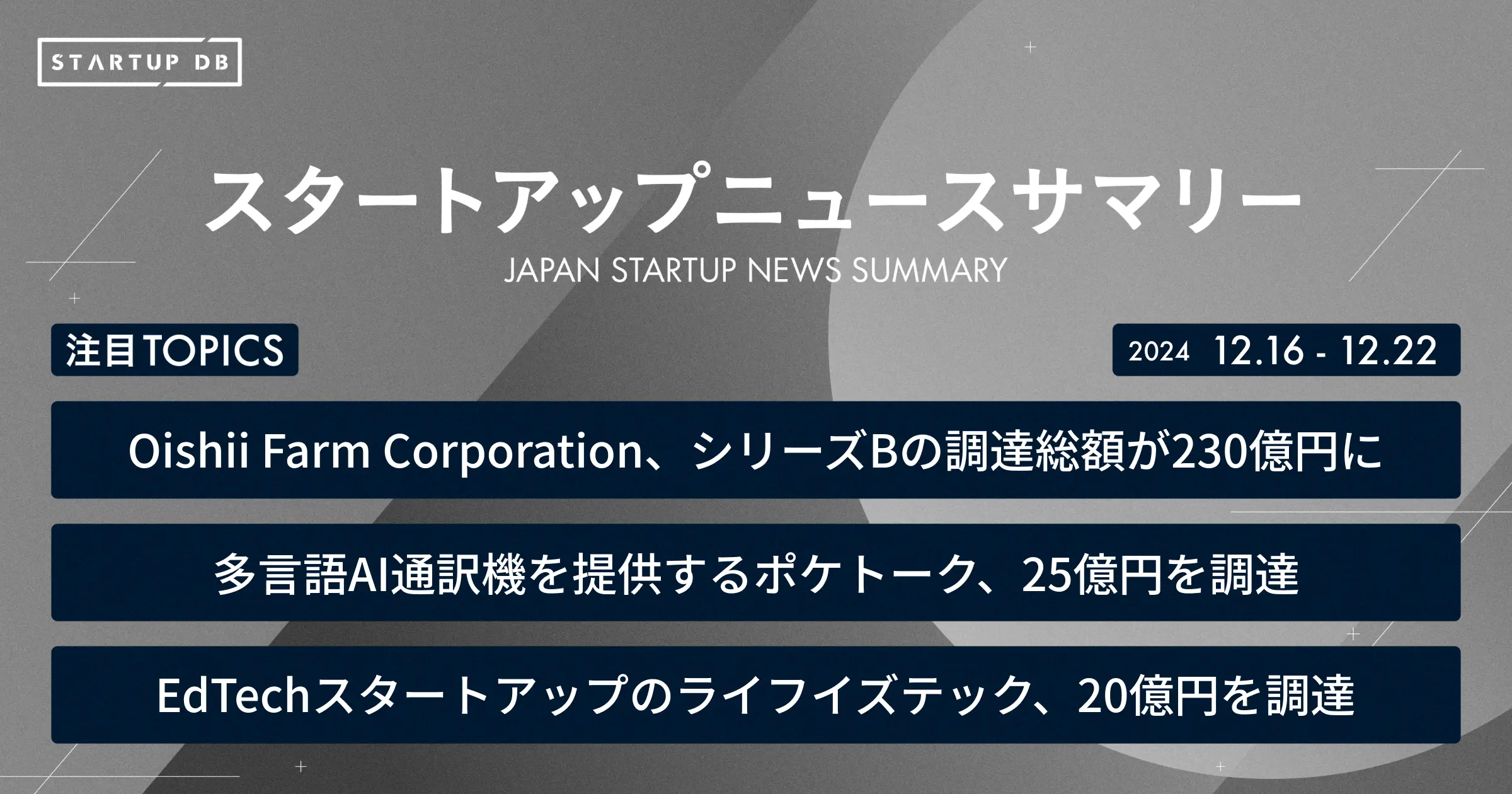 国内の成長産業やスタートアップに関する幅広い情報を収集・整理し、検索可能にした情報プラットフォーム「STARTUP DB」では毎週、スタートアップニュースサマリーを配信している。