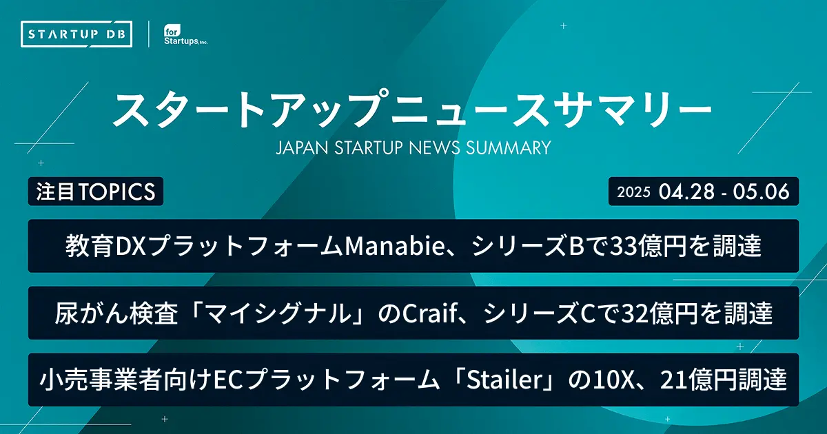 国内の成長産業やスタートアップに関する幅広い情報を収集・整理し、検索可能にした情報プラットフォーム「STARTUP DB」では毎週、スタートアップニュースサマリーを配信している。