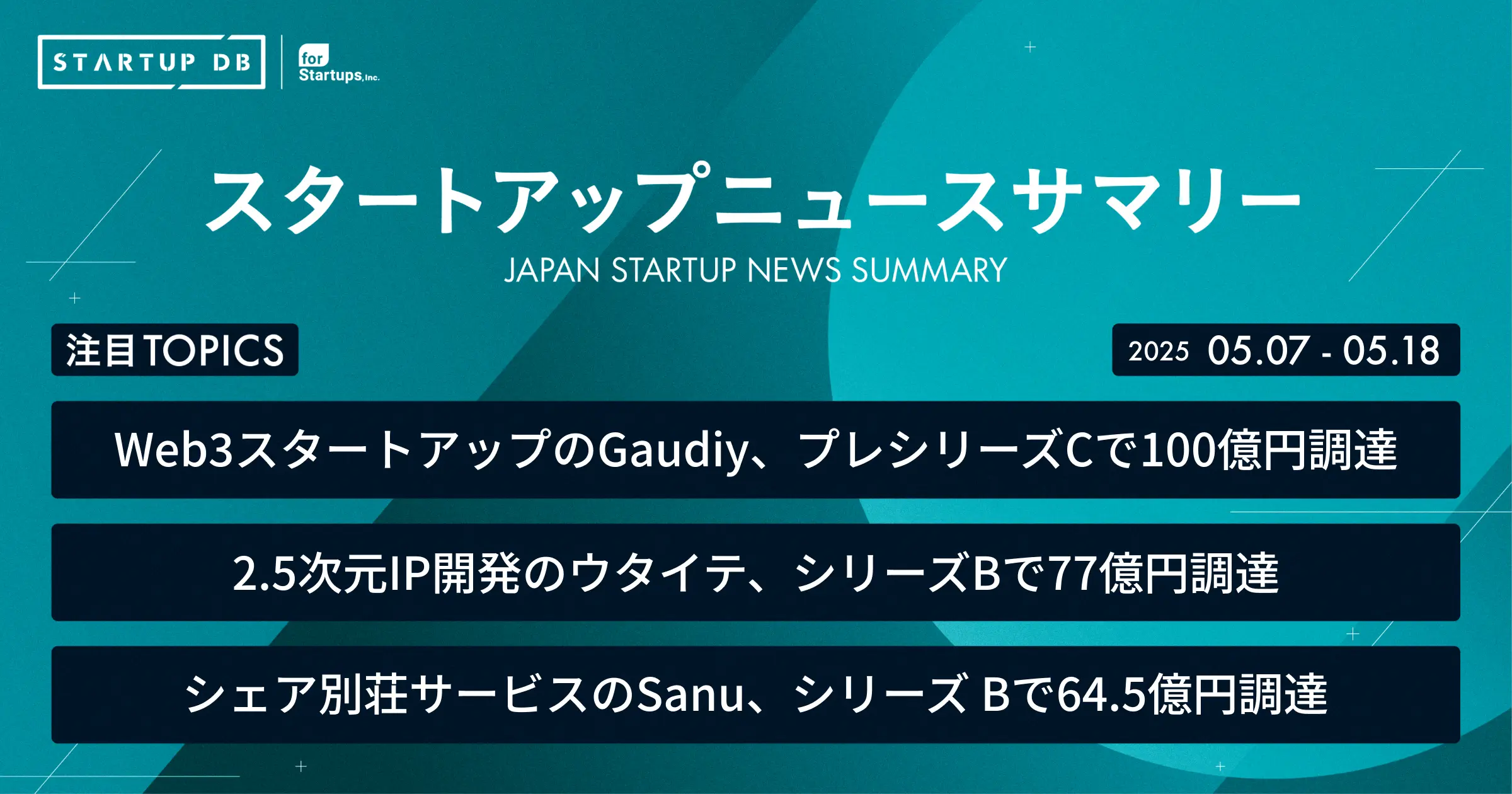 国内の成長産業やスタートアップに関する幅広い情報を収集・整理し、検索可能にした情報プラットフォーム「STARTUP DB」では毎週、スタートアップニュースサマリーを配信している。