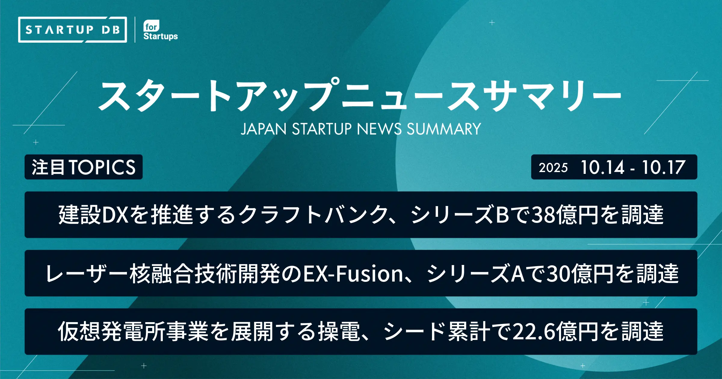 国内の成長産業やスタートアップに関する幅広い情報を収集・整理し、検索可能にした情報プラットフォーム「STARTUP DB」では毎週、スタートアップニュースサマリーを配信している。