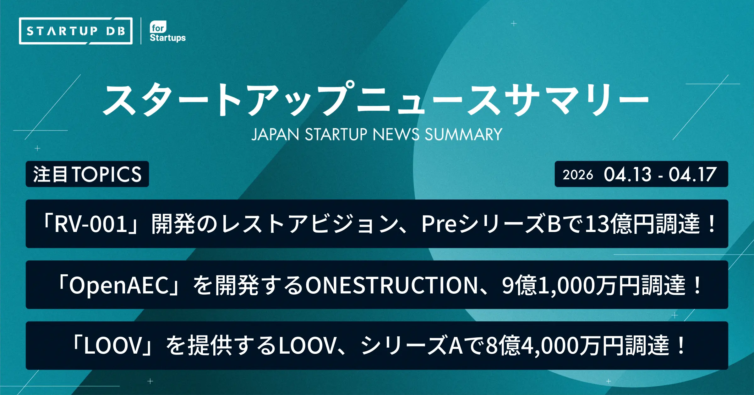 国内の成長産業やスタートアップに関する幅広い情報を収集・整理し、検索可能にした情報プラットフォーム「STARTUP DB」では毎週、スタートアップニュースサマリーを配信している。