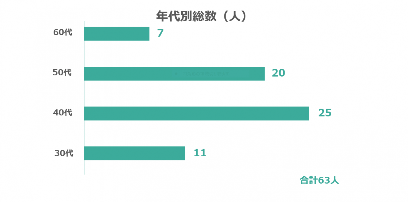 最後に年齢別の調査結果である。63社のうち最も年齢が低かったのは31歳で、最高齢は73歳であった。平均年齢としては49.3歳という結果である。