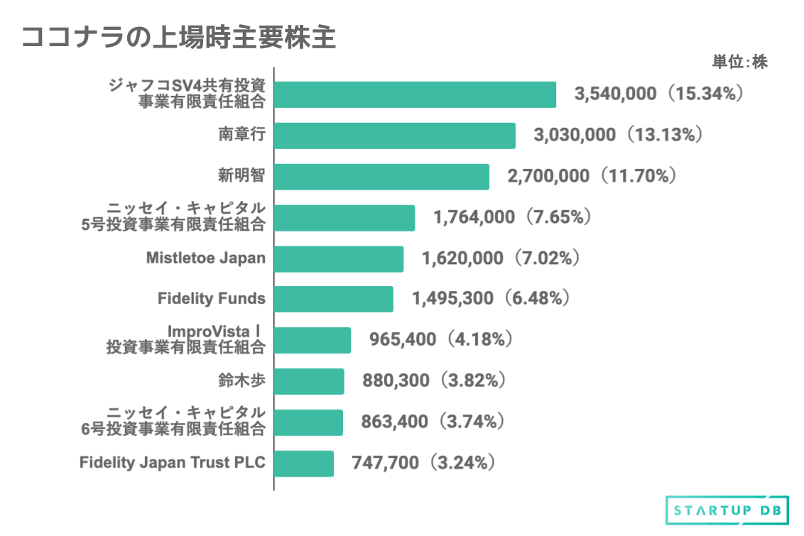 筆頭株主は日本最大のベンチャーキャピタルであるジャフコグループが運営するジャフコSV4共有投資事業有限責任組合で、15.34%を保有。次いで、ココナラ代表取締役会長の南章行氏が13.13%、取締役の新明智氏が11.7%を保有する。