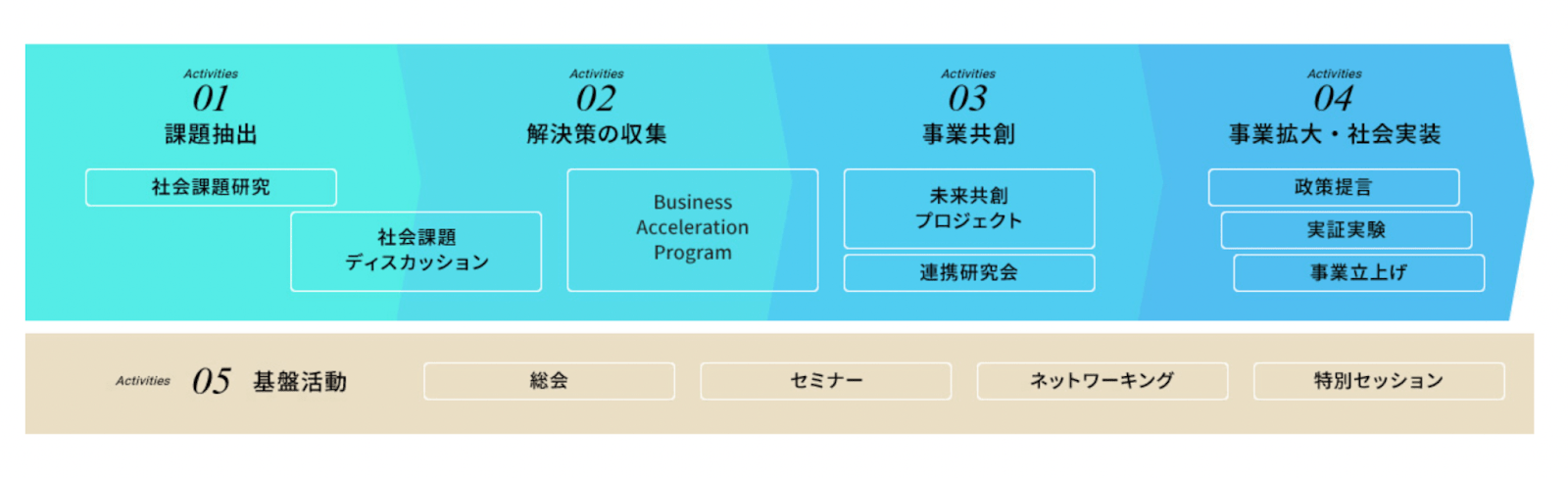 未来共創イニシアティブでは、単にネットワークを提供するわけではない。会員が掲げる社会課題テーマの解決に向け、これをアクセラレートしていく支援を指す。具体的には、社会課題の抽出からディスカッション、解決策の収集、プロジェクトや研究会などを通じた事業アイデアの創出や事業化に向けての社会実装へと進めていく流れだ。たとえばこの流れの中で、ルールや規制の緩和・見直しが必要であれば、こうした機運の醸成や関係者に働き掛けを行なうなど、実装に向けた下地を作るのも役割のひとつだ。