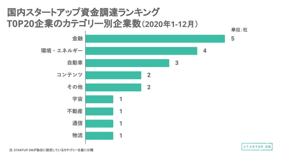 TOP20企業のカテゴリー別では金融が5社と最も多く、環境・エネルギーが4社、自動車が3社とこれに続く。
