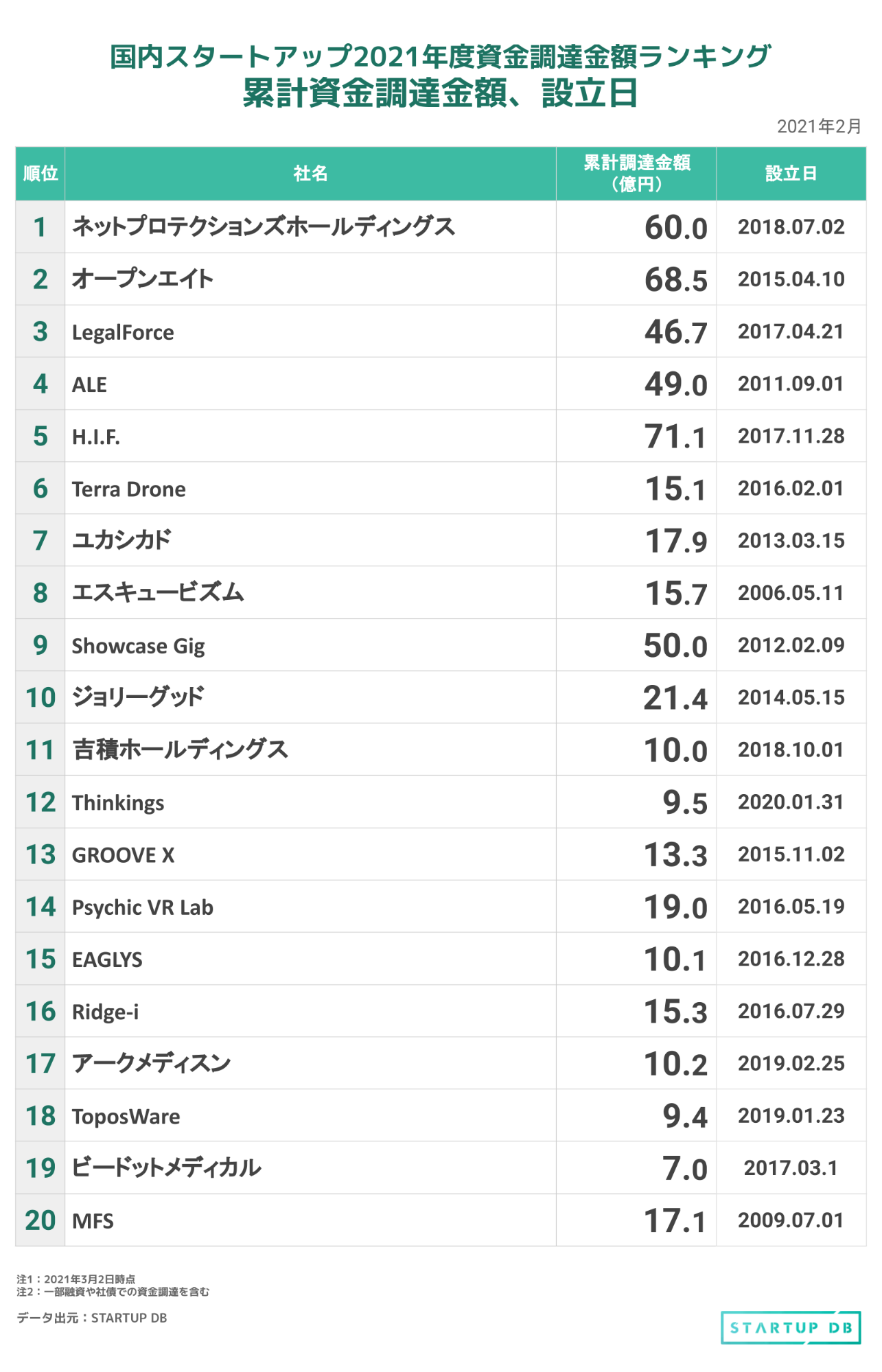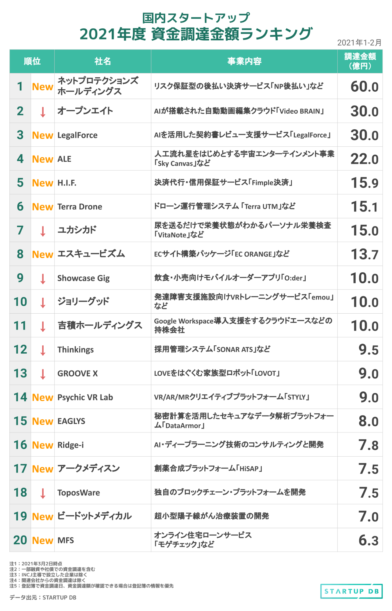 2021年1-2月までの国内スタートアップ資金調達金額ランキングでは、未回収リスク保証型の後払い決済サービス「NP後払い」を運営するネットプロテクションズホールディングスが約60億円の調達を行い、資金調達ランキングのトップに躍り出た。また、10億円を超える資金調達では、LegalForce、ALE、H.I.F.、Terra Drone、エスキュービズムが名を連ね、新たに12社がランクインとなった。