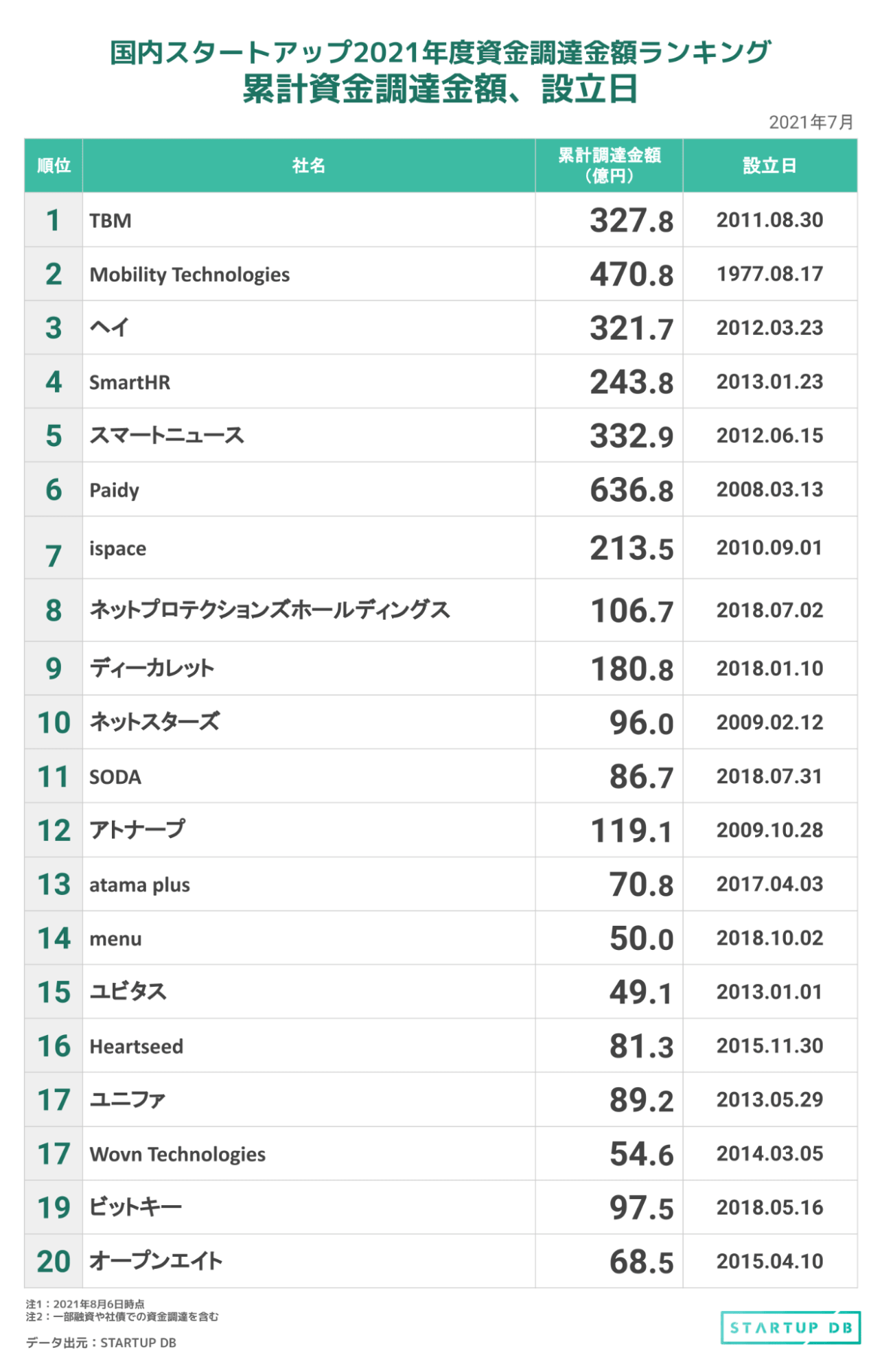 2021年1-7月の国内スタートアップ資金調達金額ランキングでは、紙やプラスチックの代替となる新素材「LIMEX(ライメックス)」を展開するTBMが135億円の調達を行い、ランキングの1位に躍り出た。また、ヘイ、ispace、SODA、アトナープ、atama plus、menu、ユビタス、Wovn Technologiesが大型の資金調達を新たに実施し、新規ランクイン企業は8社となった。