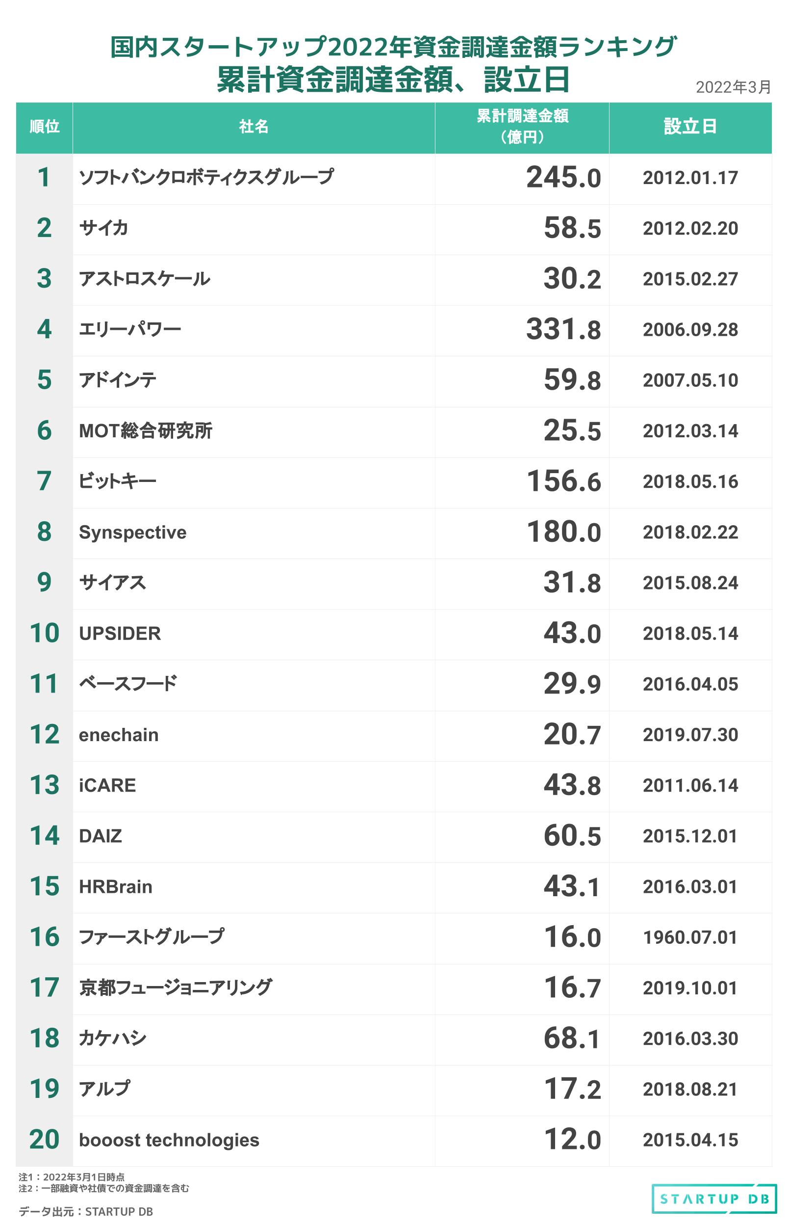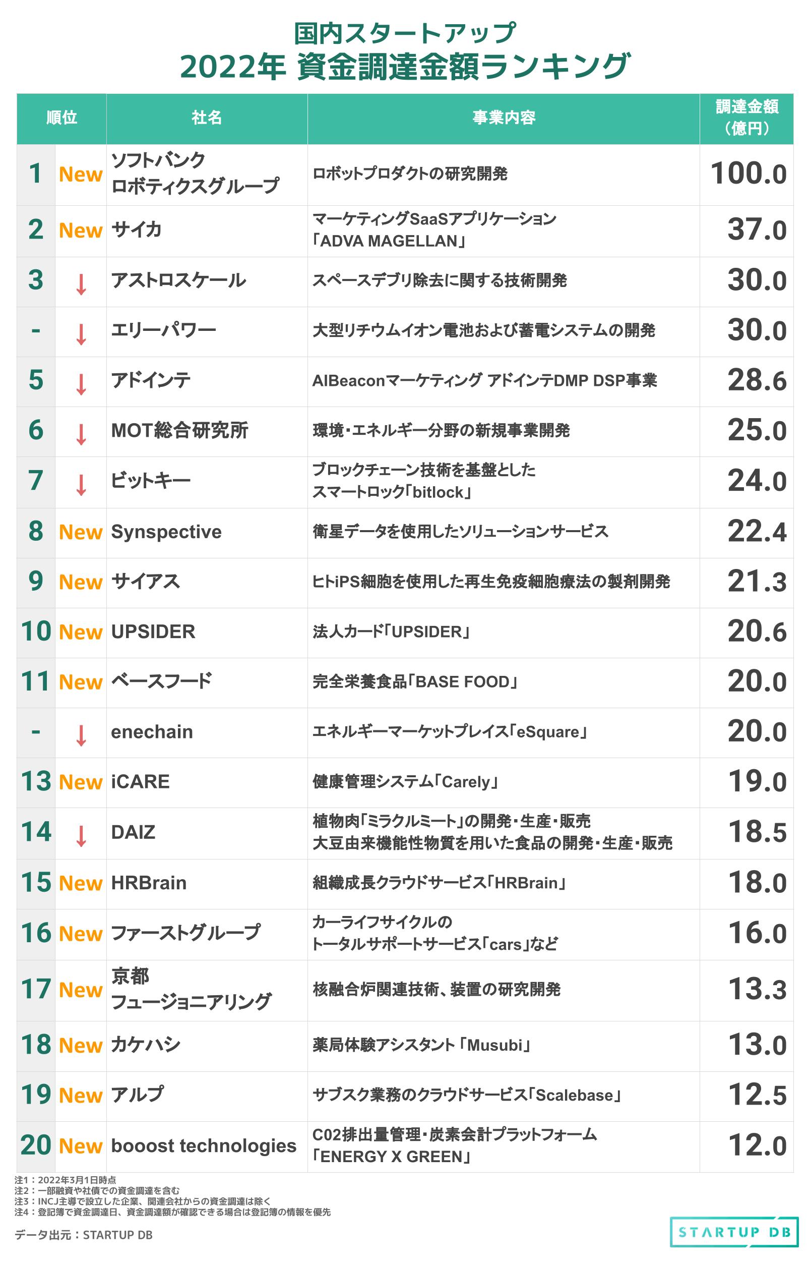 2022年1-2月の国内スタートアップ資金調達金額ランキングは、1位に新規ランクインを果たしたソフトバンクロボティクスグループや2位のサイカの他、Synspective、サイアス、UPSIDER、ベースフード、iCARE、HRBrain、ファーストグループ、京都フュージョニアリング、カケハシ、アルプ、booost technologiesの計13社が新規ランクインを果たした。