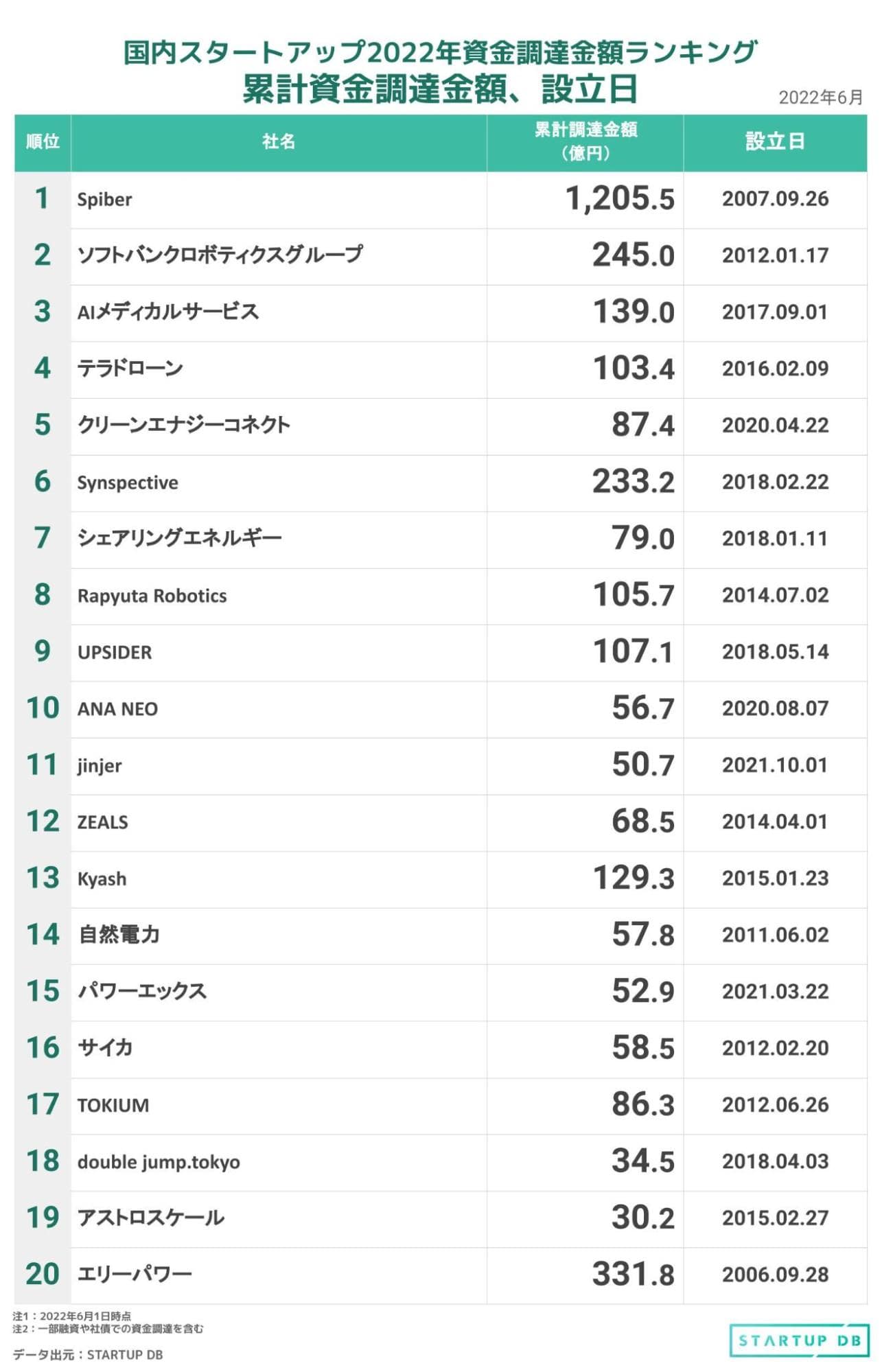 トップ20にランクインしている企業のうち、累計資金調達金額が100億円を超えている企業は、Spiber、ソフトバンクロボティクスグループ、AIメディカルサービス、テラドローン、Synspective、Rapyuta Robotics、UPSIDER、Kyash、エリーパワーの9社だ。AIメディカルサービス、Synspective、UPSIDERの3社は設立5年未満にもかかわらず、累計資金調達金額が100億円を超えている。2022年6月1日時点で、2022年5月における資金調達金額の中央値は約1億4,500万円、平均値は約7億円、資金調達金額の合計は約364億3,045万円となった(一部融資や社債での資金調達を含む)。