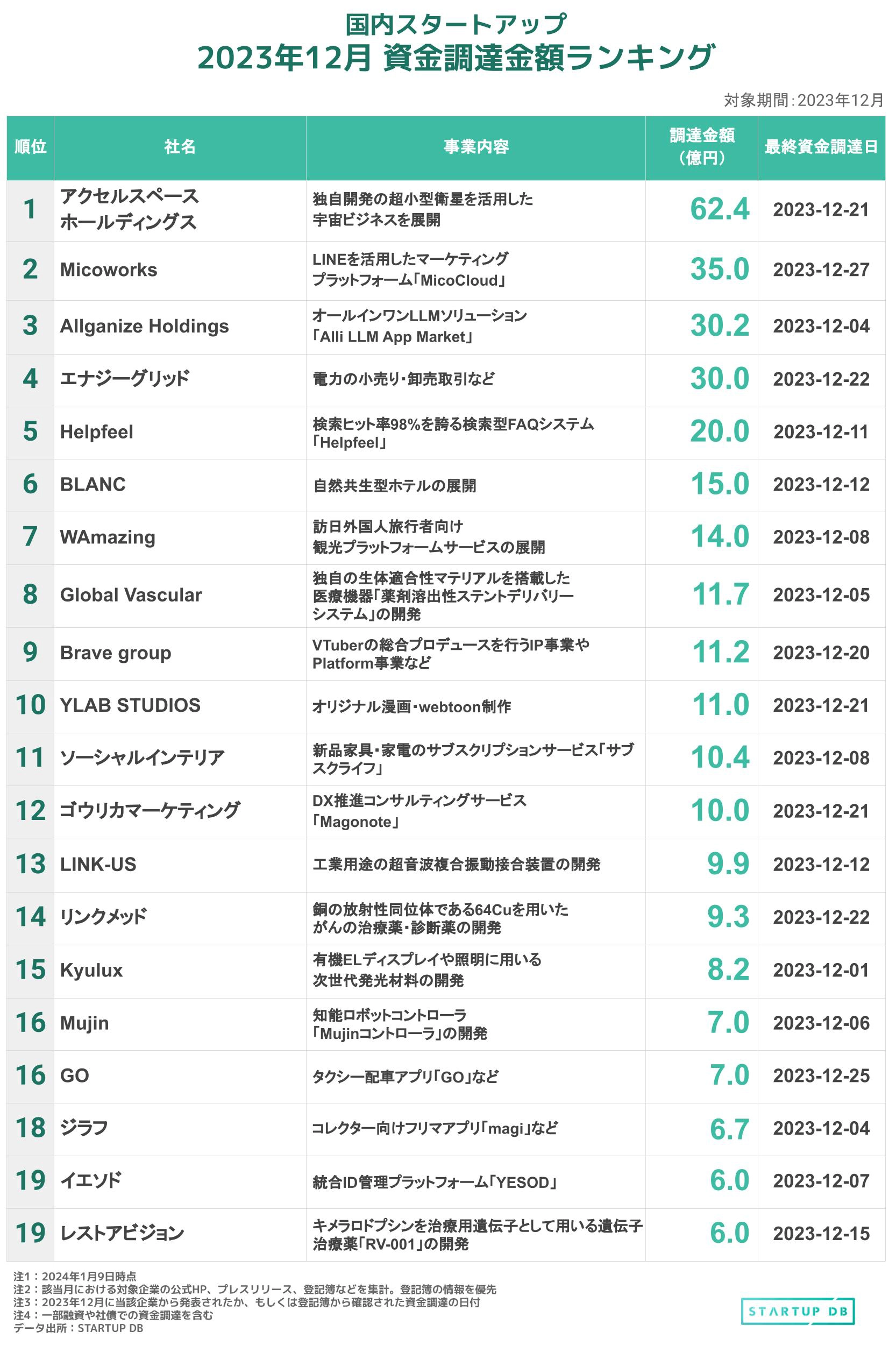 2023年12月に発表された資金調達を金額ベースでランキング形式にまとめた。