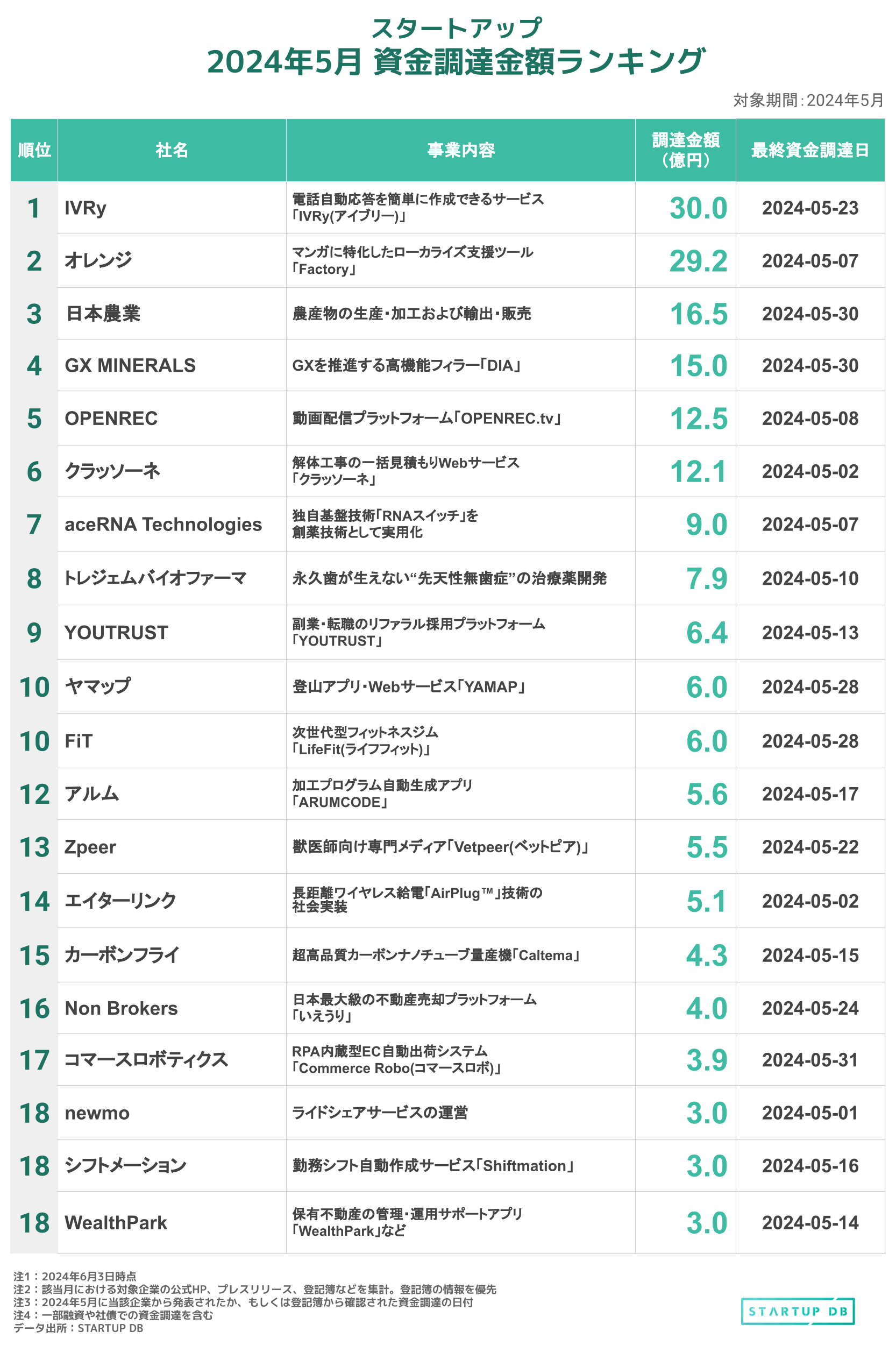 2024年5月に発表された資金調達を金額ベースでランキング形式にまとめた。