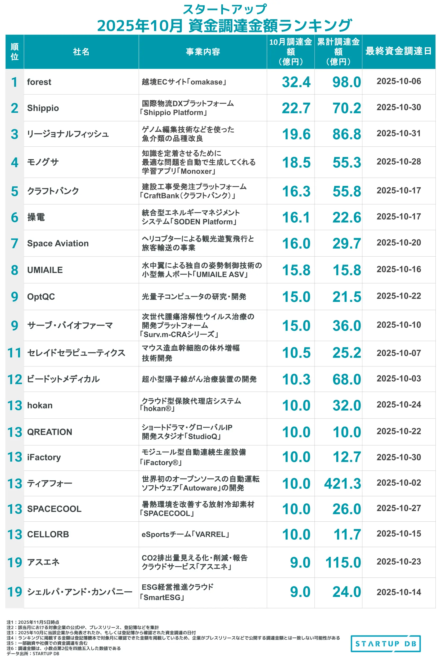 2025年10月の資金調達額の合計をランキング形式で並べた。原則的に登記簿から取得した調達日を優先しており、次点でプレスリリースなどの公式発表も集計している。
