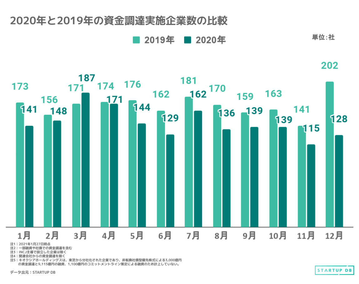 STARTUP DBが集計したデータより、2020年と2019年のスタートアップ全体の資金調達動向を紐解いていく。まずは月別資金調達額を比較していく。