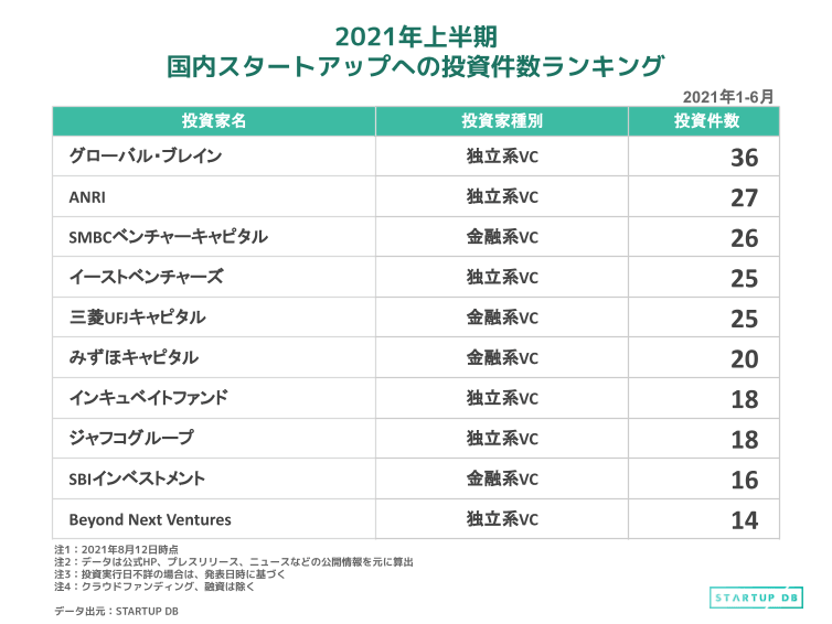 一方、2021年上半期のランキングを見ると、独立系VCであるグローバル・ブレインとANRIが順位を上げ、上位2社にランクイン。11社のうち6社が独立系VCという結果になった。