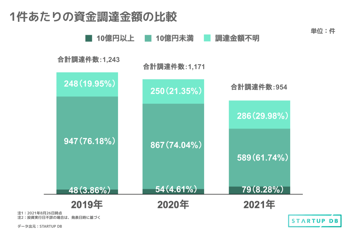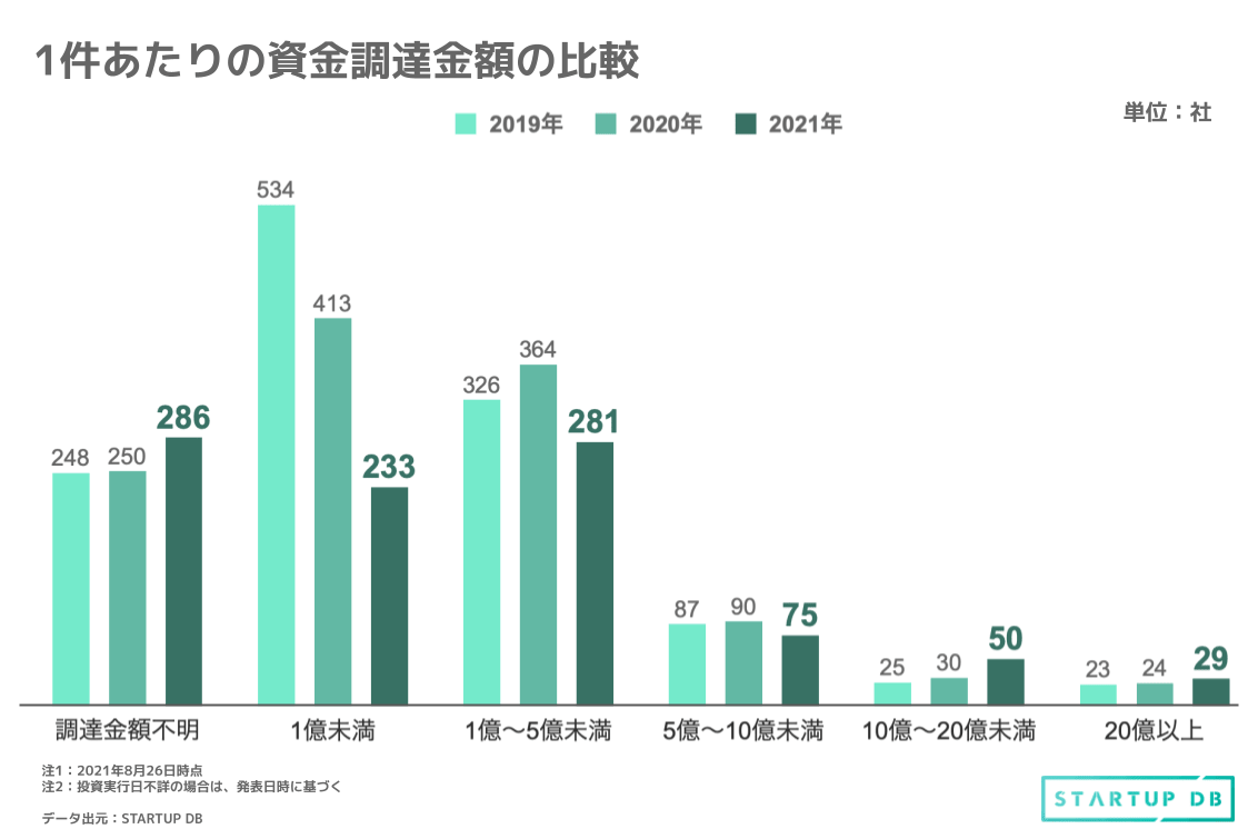 このデータから、スタートアップによる大型調達の増加、全体的な調達金額の上昇がうかがえる。
