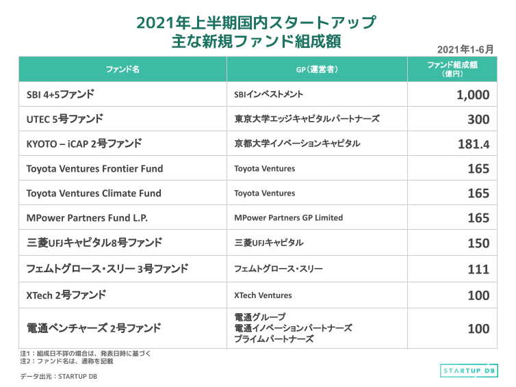 2021年上半期において、50弱に及ぶファンドの新規組成が公開された。中でも、SBIインベストメントの「SBI 4+5ファンド」は1,000億円規模に上り、金額において他ファンドより目立つ存在だ。