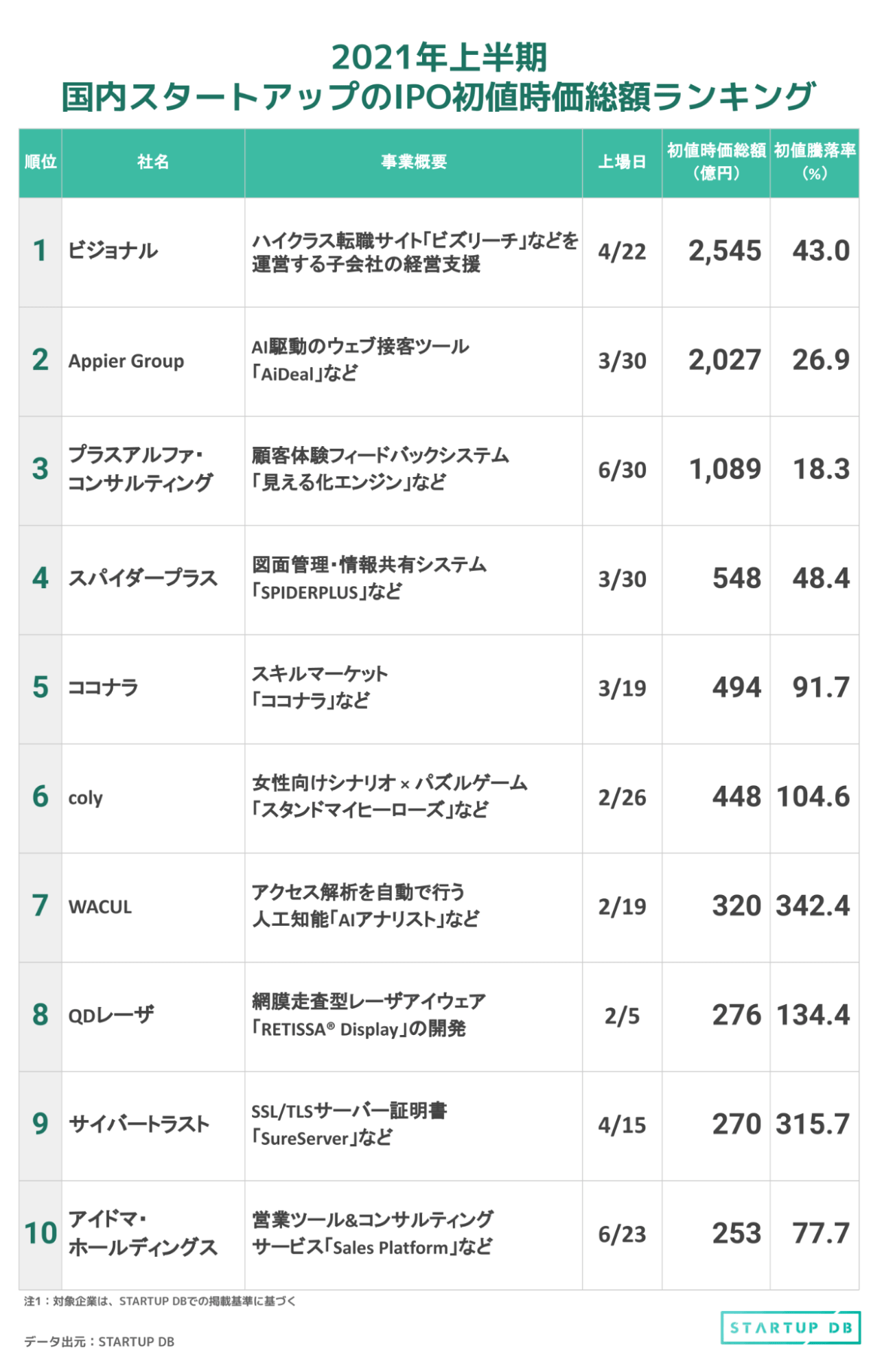 スタートアップのIPO情報、初値時価総額トップはビジョナルの2,545億円
