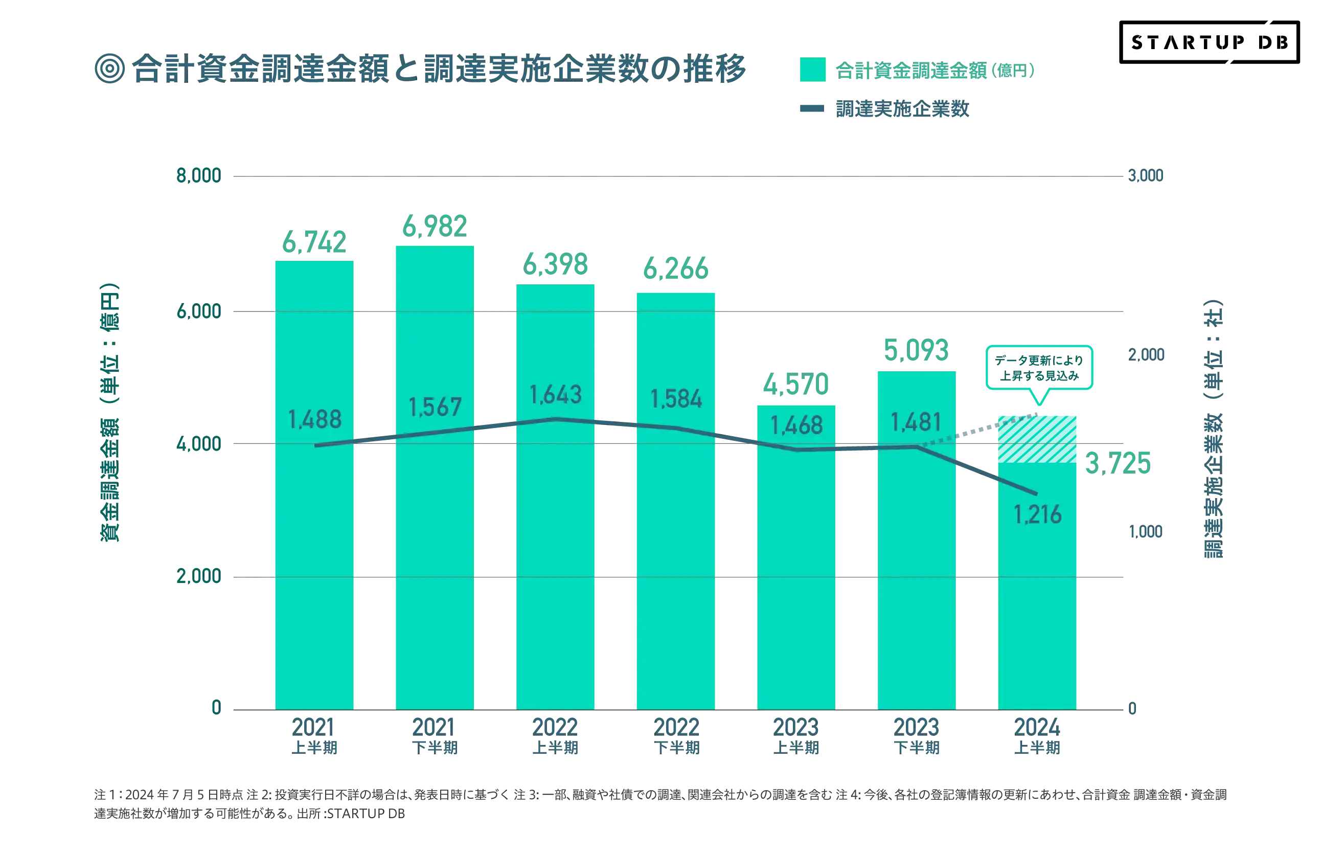 また、データ集計時点の速報値であり、今後新たな調達の判明などにより金額は上昇する。確定値は4,249億円程度になるとみられている。2023年上半期(4,570億円)よりも300億円余り、同下半期より800億円以上減少する見込みとなった。