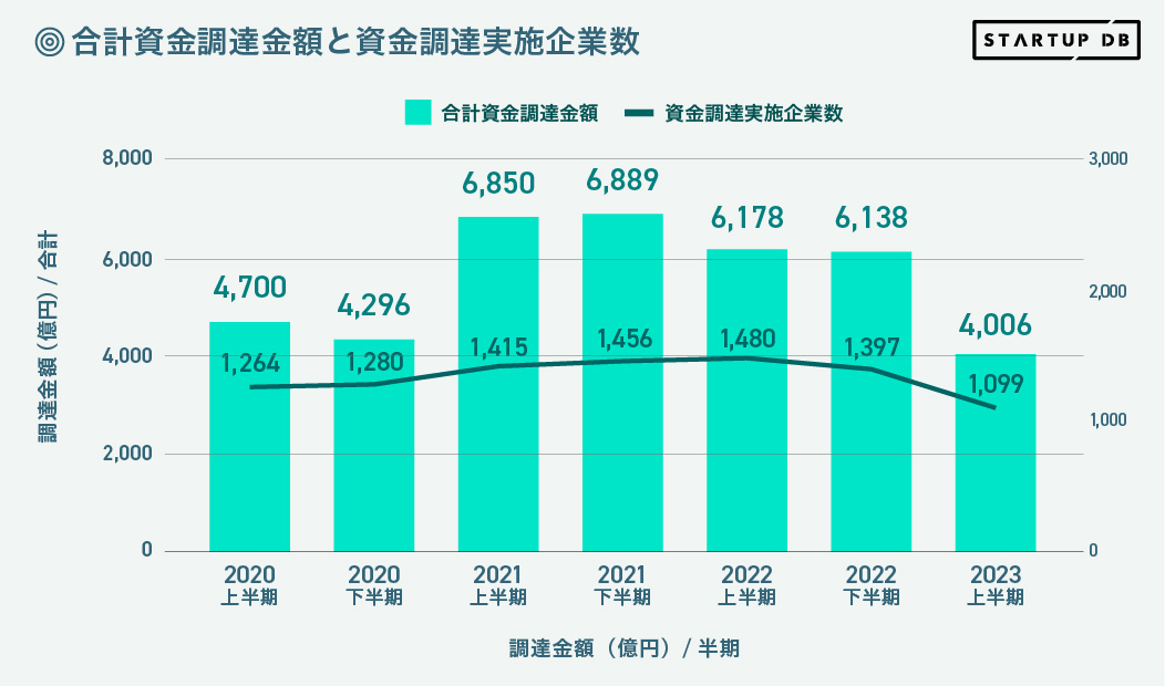 2023年上半期の資金調達金額は4,006億4,100万円だった。これは新株を発行するエクイティファイナンス(用語解説)だけでなく、融資などのデットファイナンス(用語解説)、それにクラウドファンディングによる調達などの総額だ。