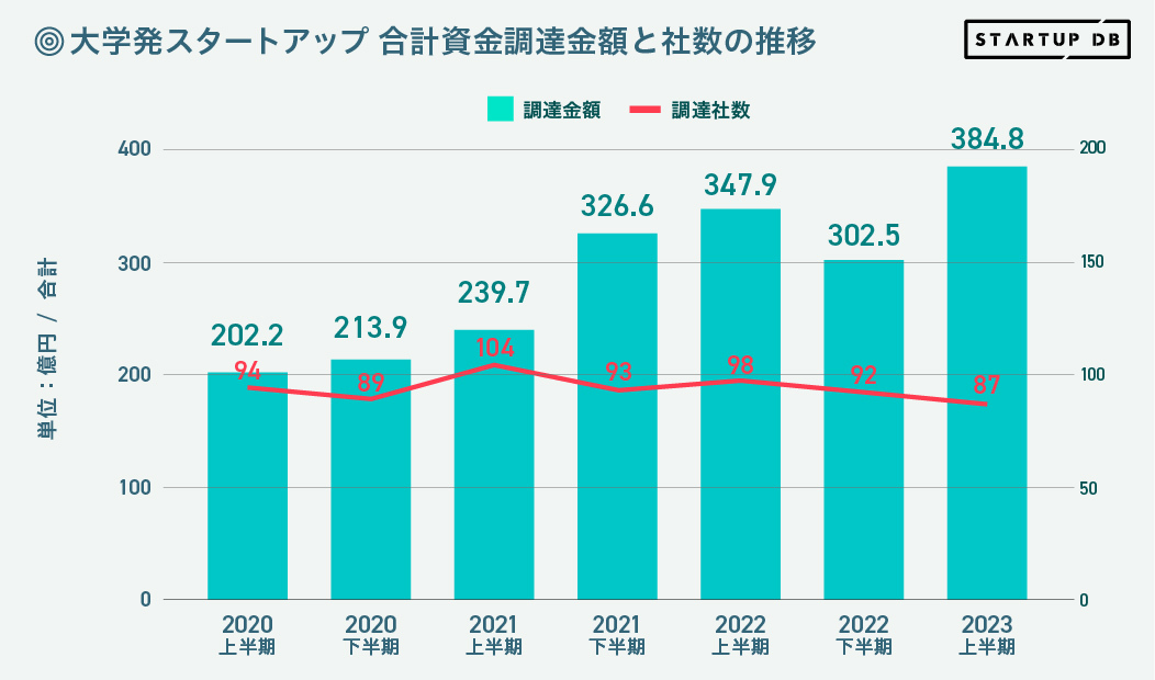 全体の調達金額・実施社数とは異なる傾向を示しているのが大学発スタートアップだ。2023年上半期の調達金額は384億8,000万円で、前の年の同じ時期から37億円ほど増加した。実施社数は87社とわずかに減った。