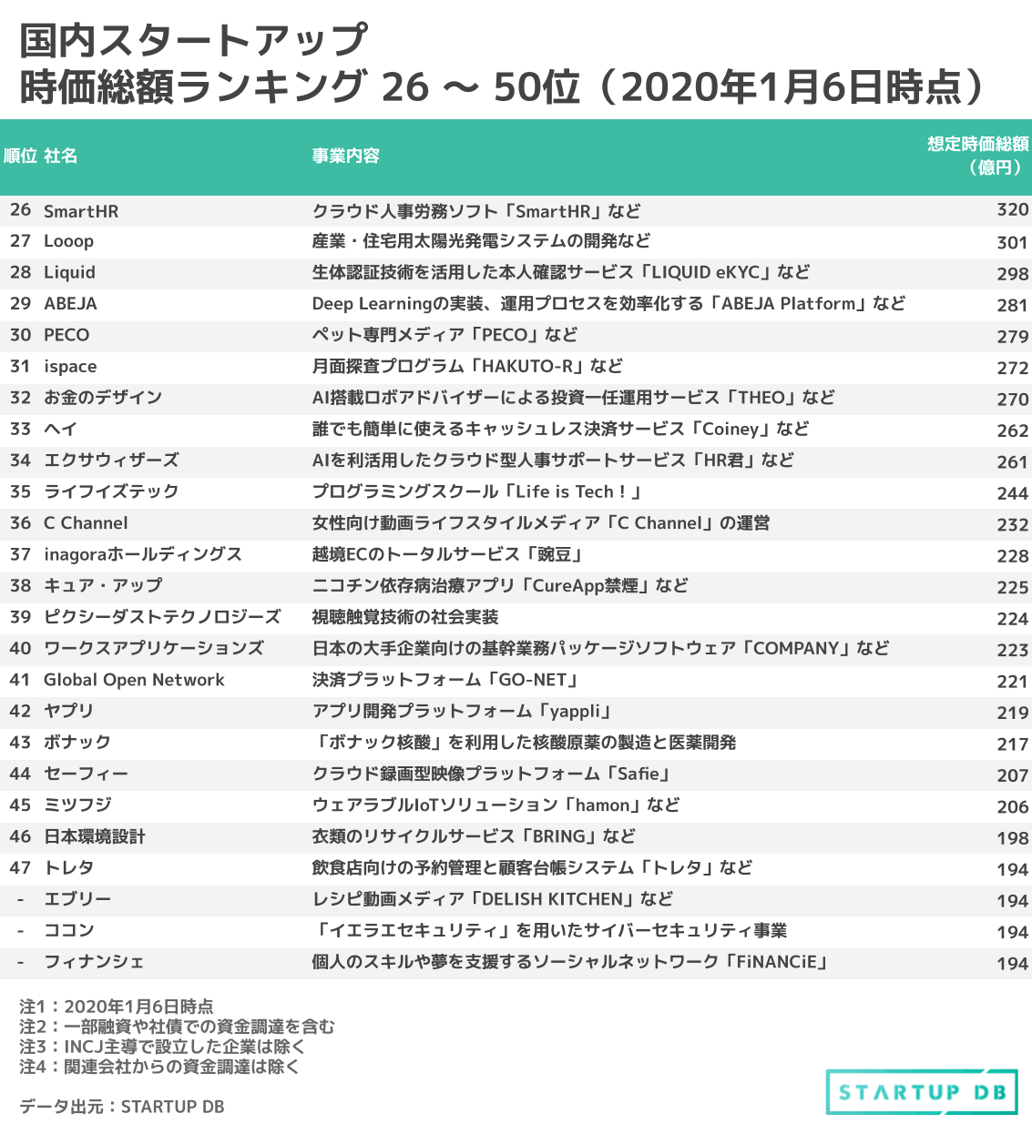 2019年は国内ユニコーン企業数が6社に増えた。2018年時点では現在1位であるPreferred Networksと2018年に上場したメルカリの2社しかなかったことを考えると、日本のスタートアップの成長が著しいことがわかる。しかし、CB Insightsの調査によると、米国発のユニコーン企業は累計で150社を超えており、グローバルリーダーには程遠いのが現状だ。今回は国内スタートアップの想定時価総額を1位から50位までまとめた。ランキングに入っている各スタートアップの領域をみてみると、ディープテックが15社、SaaSが11社、フィンテックが9社であった。ディープテック領域の内、Preferred Networks、クリーンプラネット、TBM、TRIPLE-1の4社がユニコーンとなっており、国内ユニコーン企業数の2/3を占めている。SaaS領域ではKARTE運営のプレイド、HRMOSの運営の他、転職サイトBizReachの運営も行なっているビズリーチ、b-dash運営のフロムスクラッチ、SmartHRなどがランキング入りを果たしている。プレイドはGoogleからの調達を、フロムスクラッチはKKRやゴールドマン・サックスなどから約100億円の調達を、SmartHRは UberやSlack、Lyftなどに投資を行なっているLight Street Capitalなどから61億5000万円の調達を実施しており、海外投資家からも注目されている。フィンテック領域ではリキッドグループがユニコーンに、そのほかにもOrigami、ウェルスナビなどが見受けられた。STARTUP DBでは今後も想定時価総額のランキングレポートを出していく。その中でさらなるユニコーン企業が生まれ、世界へ羽ばたき、成長していく姿をこれからも注目していただきたい。