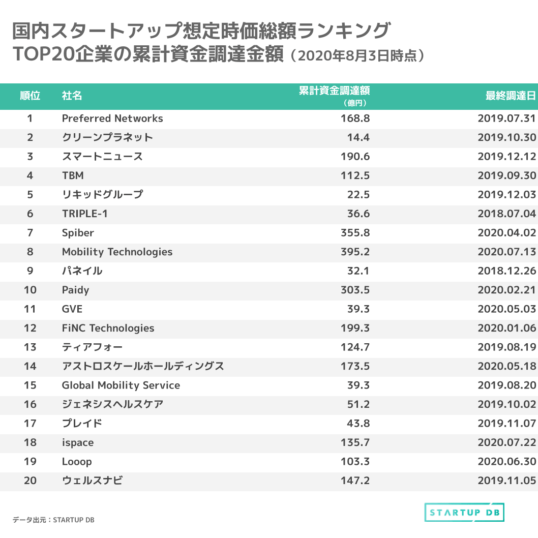 2020年8月の想定時価総額ランキングでは、ispaceとLooopがそれぞれ18位と19位に新規ランクインした。また、上位20社の想定時価総額が全て400億円超えを達成した。ispaceは2020年7月末に、民間月面探査プログラム「HAKUTO-R」Mission1ランダー(月着陸船)の最終デザインの完成を発表しており、2021年中に組み立てに着手し、2022年に打ち上げを予定している。登記簿情報から、2020年7月に新たに29.9億円の調達をしていたことが明らかになった。関連記事:宇宙とスタートアップをつなぐ。ispace社長・袴田氏の起業論
