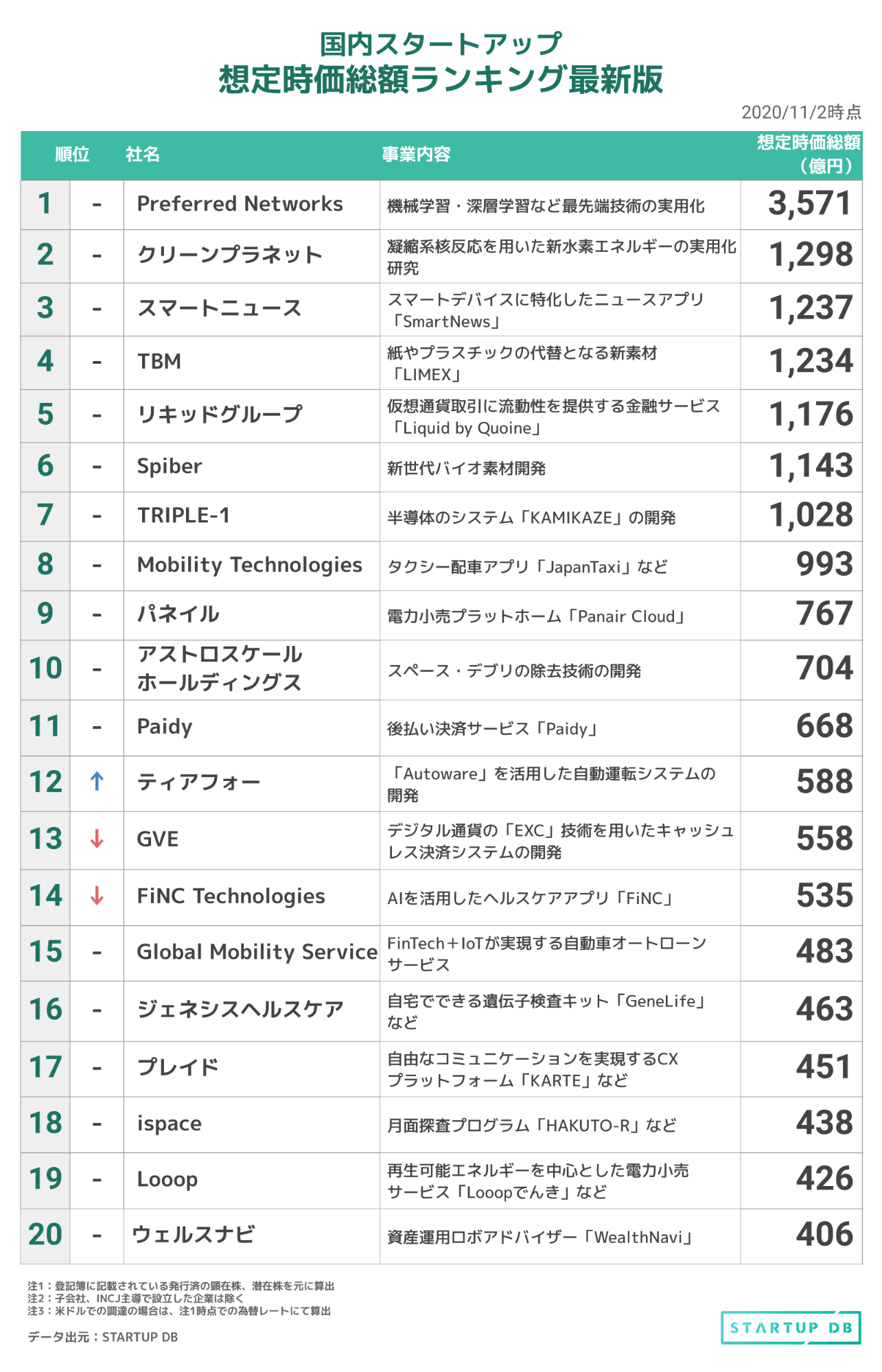 先月のTOP20企業の累計調達金額から大きな変化がみられたのは、Spiberとアストロスケールホールディングスだ。これまでSpiberは、およそ415.8億円を調達している。同社は、構造タンパク質素材「Brewed Protein™️(ブリュード・プロテイン™️)」を開発する、山形県鶴岡市に拠点を置くバイオベンチャー。2020年10月には米国の穀物メジャーのArcher Daniels Midland Company(以下、ADM)と提携、同時にADMを引受先とする第三者割当増資による約59億円の資金調達を実施した。2020年10月時点、同社はタイに工場を建設中、2021年中の稼働を目指している。また、想定時価総額ランキングで10位となっているアストロスケールホールディングスは約55億円の資金調達を行い、累計資金調達額は218.2億円となっている。今回の資金調達の詳細は、2020年10月にエースタートをリード出資とした、アイネット、清水建設、スパークス・イノベーション・フォー・フューチャーからのシリーズEラウンドによる第三者割当増資となっている。今回の調達を受けて、重要な社会インフラとして宇宙からのサービスやデータを安心して活用できるよう、デブリの低減・除去、軌道上サービスのミッション実現に向けての動きを加速させる。スペースデブリ(宇宙ごみ)という世界でも最も複雑な社会課題に対して、技術、ビジネスモデル、法規制に取り組んでいく方針だ。同社の創業者兼CEOの岡田光信氏は、2020年10月15日に行われた国際宇宙航行連盟(International Astronautical Federation)の総会にて、副会長に選任されており、宇宙産業のさらなる振興に尽力していく。