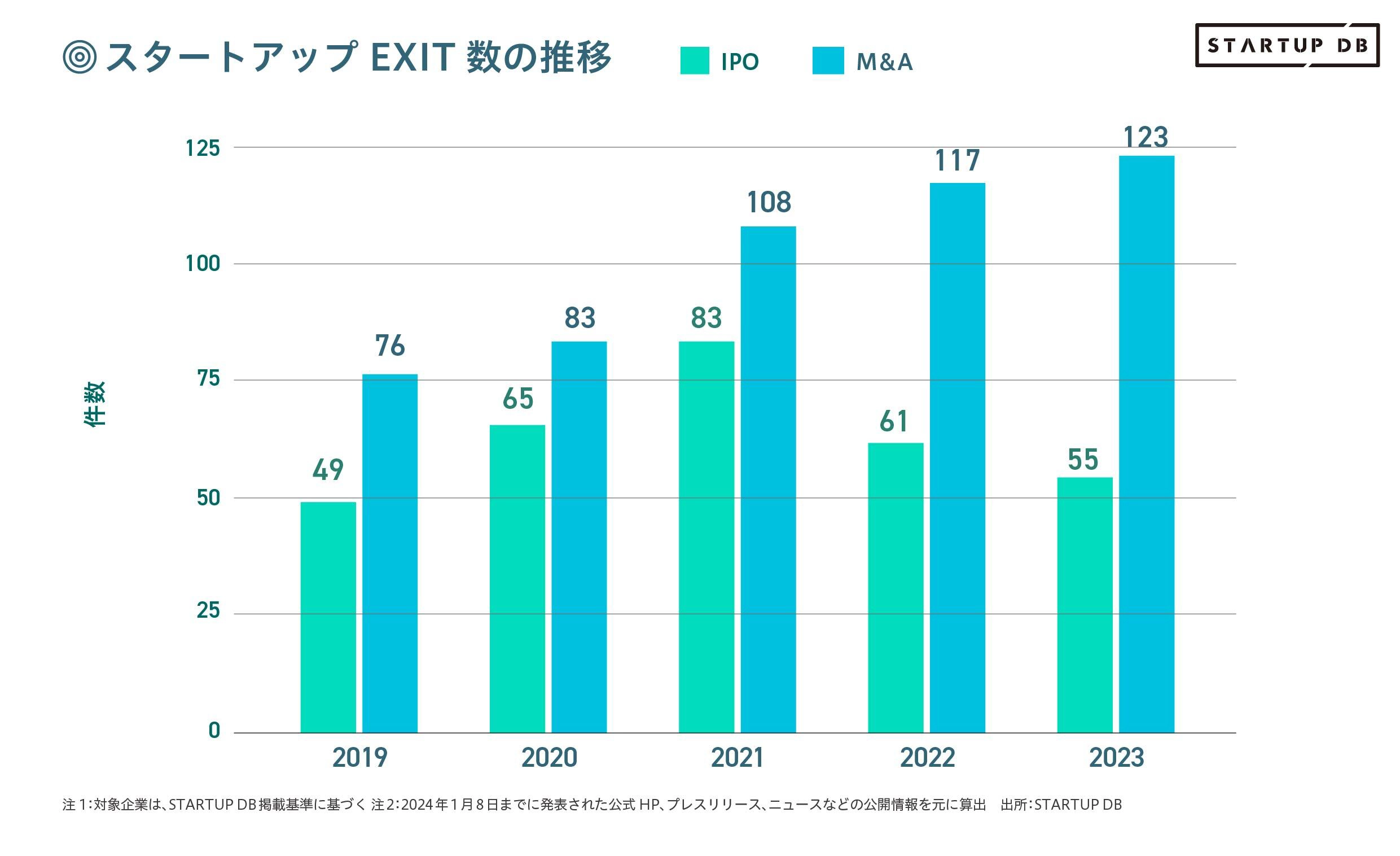 STARTUP DBの調査によると、国内スタートアップの2023年のM&A(合併・買収)件数は123件。