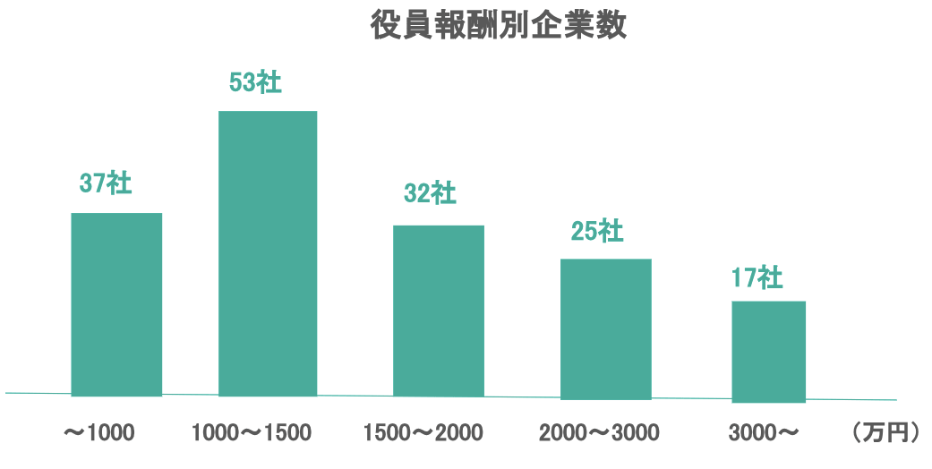次は役員報酬に関してみていく。一人当たりの役員報酬は全164社(2社役員報酬不明企業あり)平均で1,775万円であった。役員報酬別企業数が以下のグラフである。