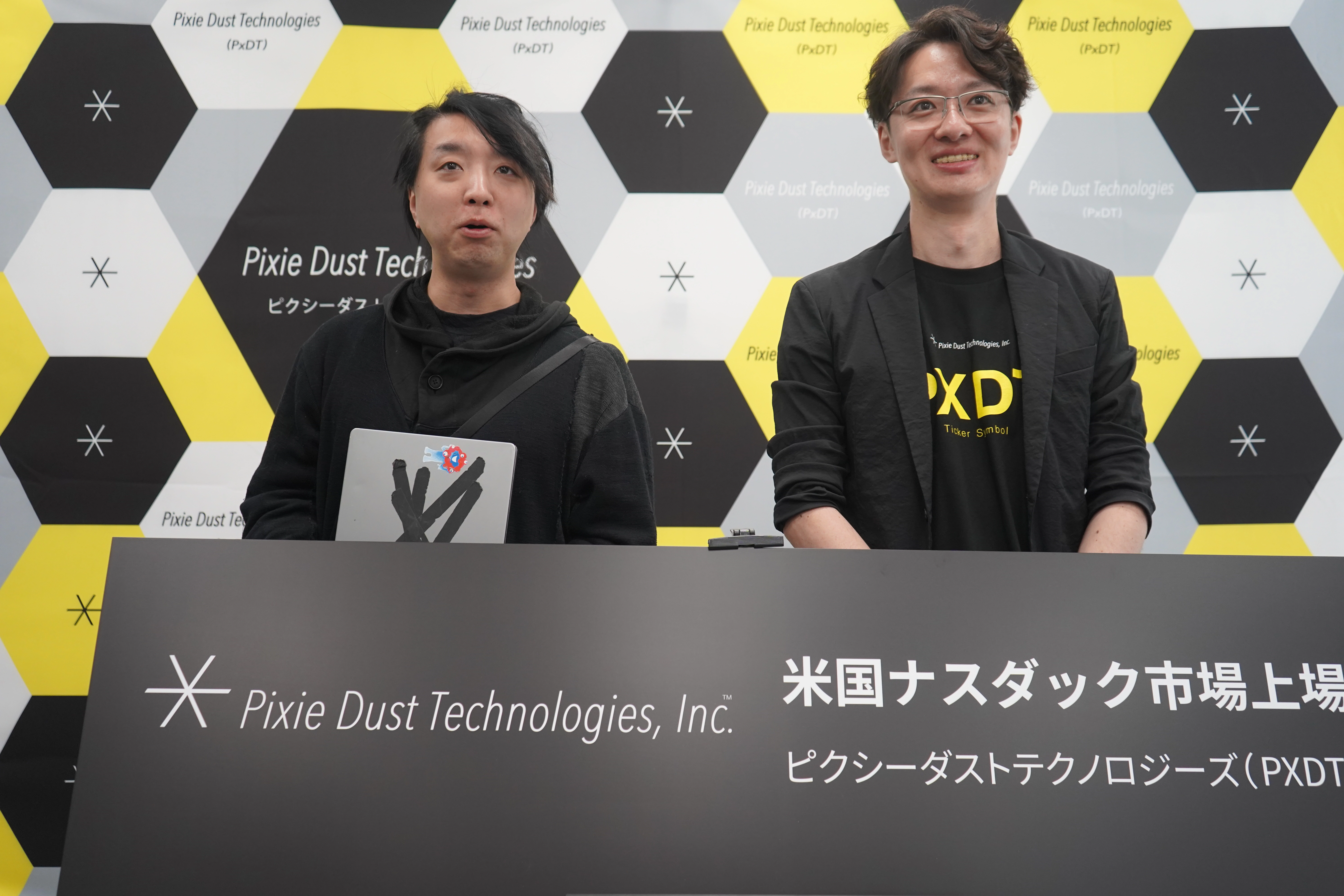 19日に東京千代田区の同社で開かれた記者会見には、メディアアーティストとしても知られる落合陽一・代表取締役CEOと村上泰一郎・代表取締役COOが出席し、ナスダック上場の狙いなどについて明かした。