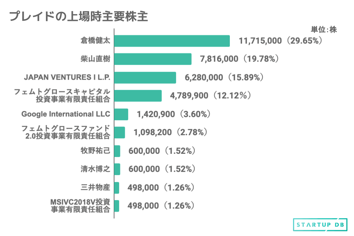 筆頭株主は、同社代表取締役である倉橋氏であり、29.65%を保有する。次いで、取締役CPOの柴山氏が19.78%、JAPAN VENTURES I L.P.を運営するEight Roads Ventures Japanが15.89%を保有する。