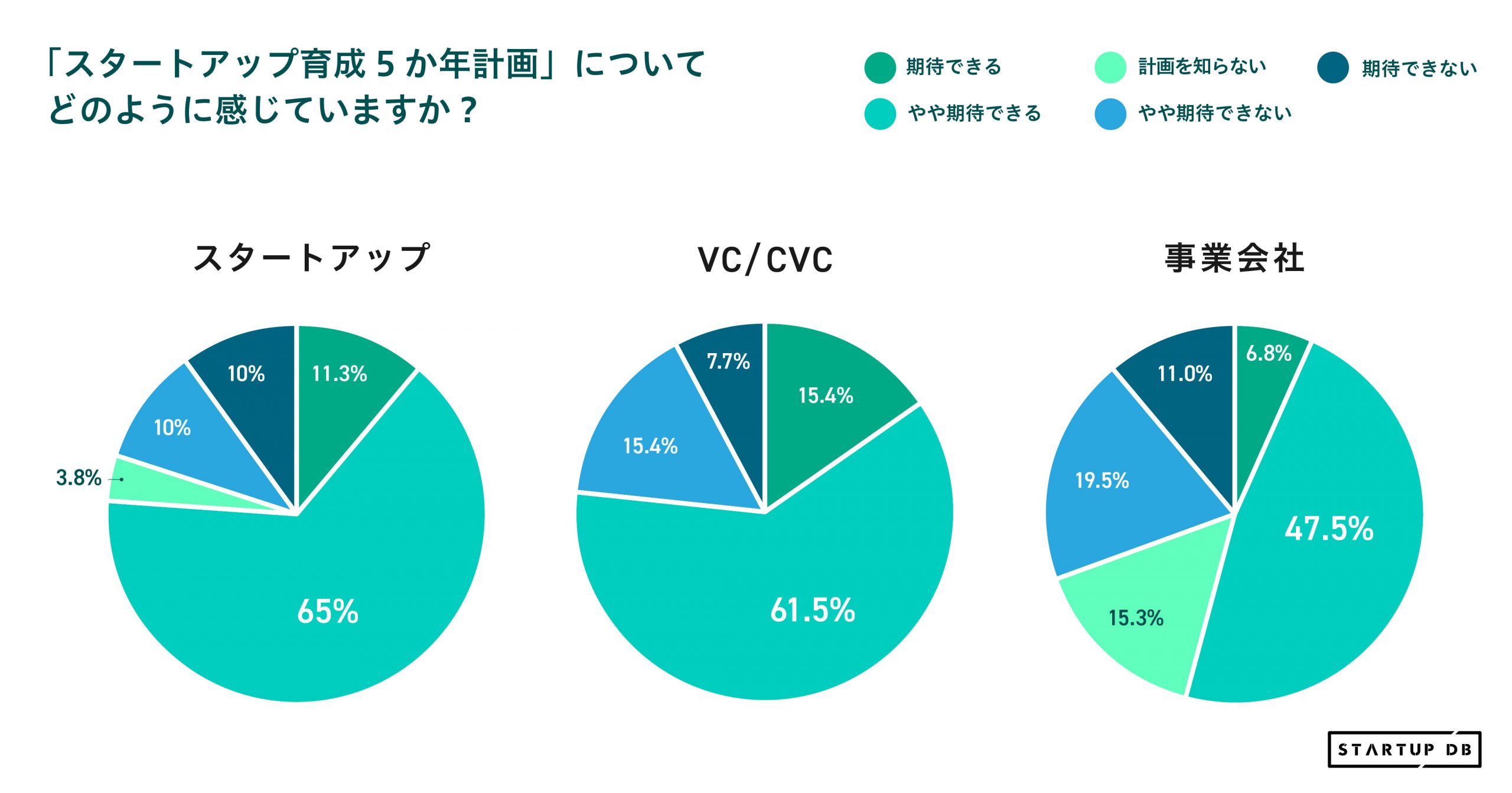 5か年計画についての感じ方を尋ねたところ、「期待できる」か「やや期待できる」と答えた割合は▽スタートアップで76.3%▽投資家で76.9%▽事業会社で54.3%といずれも高かった。事業会社の割合が比較的低かったのは、「計画を知らない」が15.3%存在していたことが影響しているとみられる。