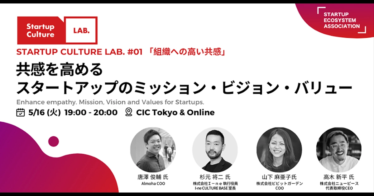 このセミナーはスタートアップエコシステム協会(SEAJ)が主催したもので、12回連続で開かれる研究プロジェクトの第1回。スタートアップの「ミッション・ビジョン・バリュー」をテーマに、実際に組織開発に携わっている当事者たちが自身の体験やそこから得た知見などについて語り合った。