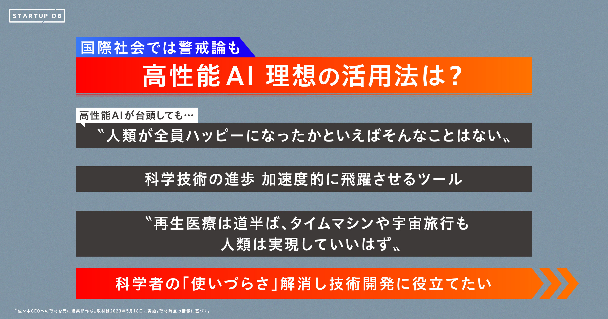 「本当に人類のためを考えるならば規制せずにどんどん進めていくべき、という考えはベースにあります。ただこれだけのビッグテクノロジーであれば、人類の生活などを守りながら進んでいくことも必要かもしれません」と佐々木さんは理解を示す。