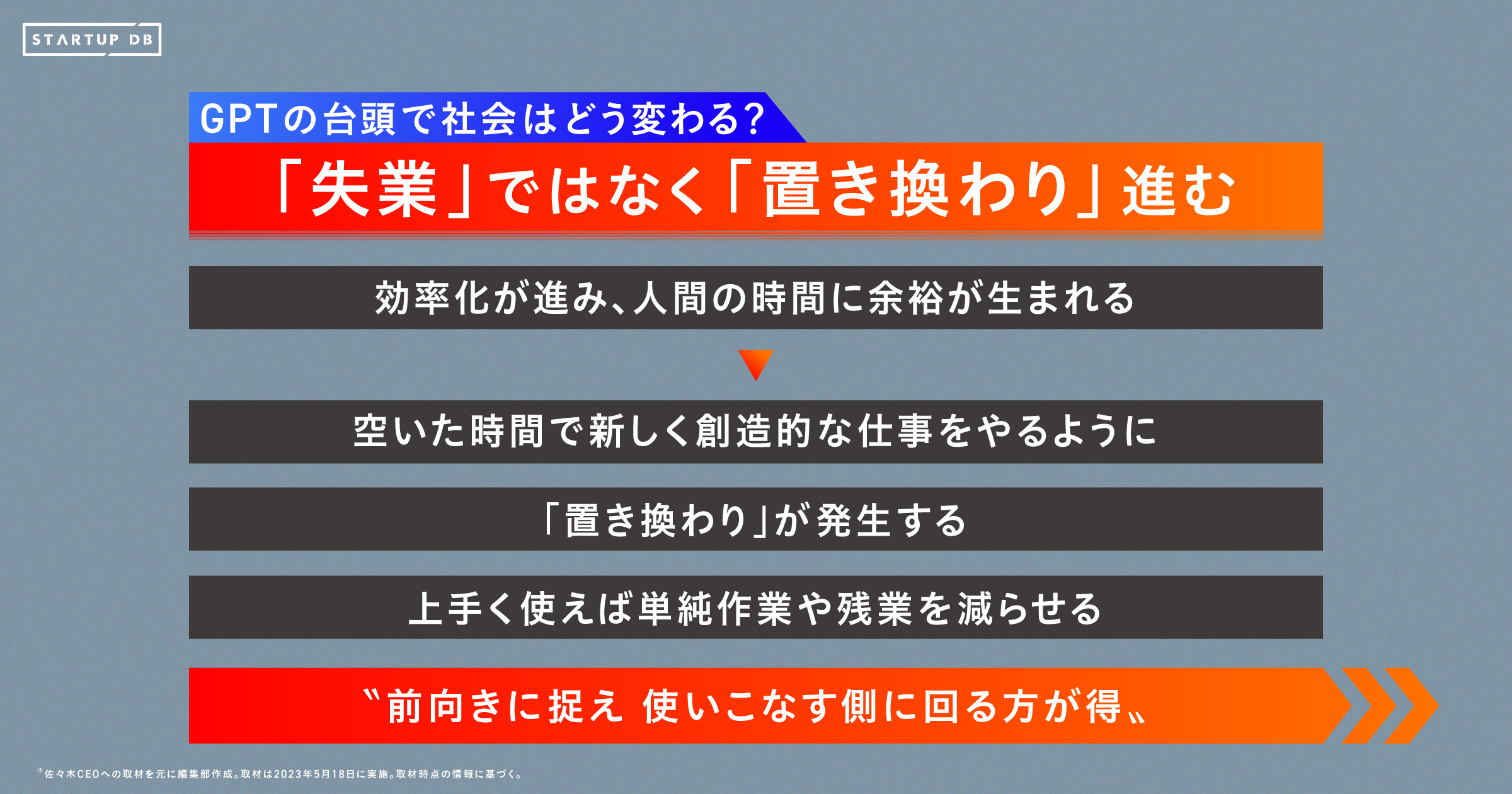 Googleなどの検索エンジンで表示されやすい「SEO」記事の作成や、顧客の質問や要望に自動で返答する「チャットボット」としての活用事例が多かった。こうした領域から人間は仕事を失うのか。佐々木さんは、まず起きるのは失職ではなく「置き換わり」だとみる。