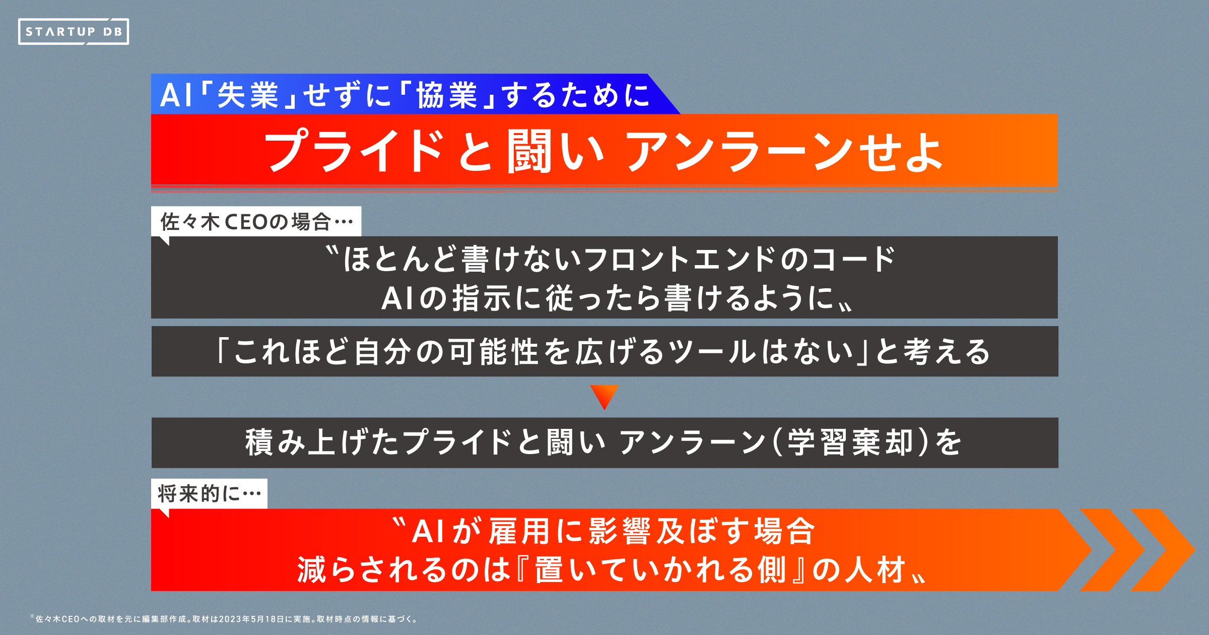 高性能AIは使いこなす側に回るべき、と佐々木さんは繰り返す。それは、AIの普及で労働時間と単価の減少が進んだ先に、雇う人間そのものを減らす未来もあり得るからだ。