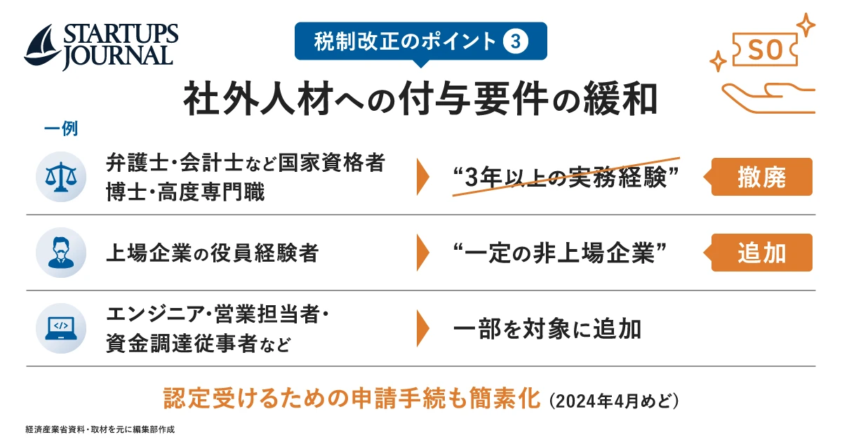 社外人材へのストックオプション付与にあたっては、事業計画を経産省に提出し、認定を受ける必要がある。この手続きについても2024年4月をめどに簡素化が図られる見込みだ。