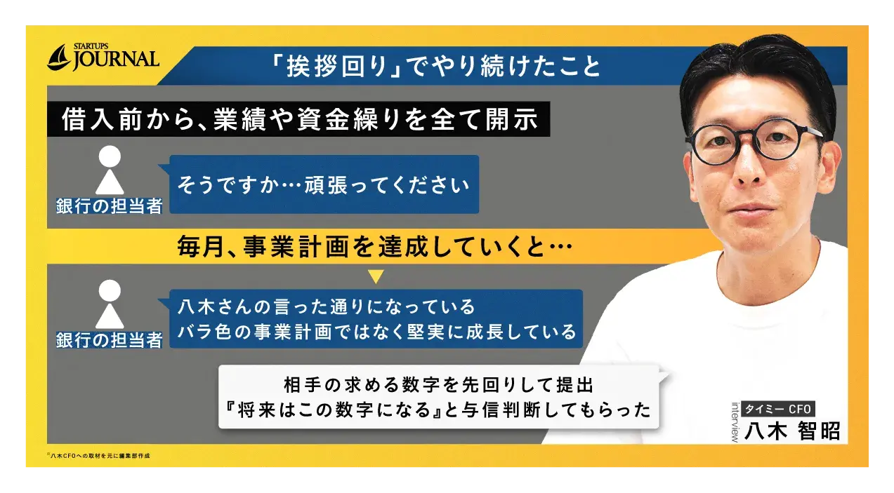 銀行の担当者との面談機会を確保し続けるための工夫も凝らした。タイミーの事業や業績を説明する傍ら、付随取引など銀行側にも複数の収益機会があることをさりげなく伝えていった。