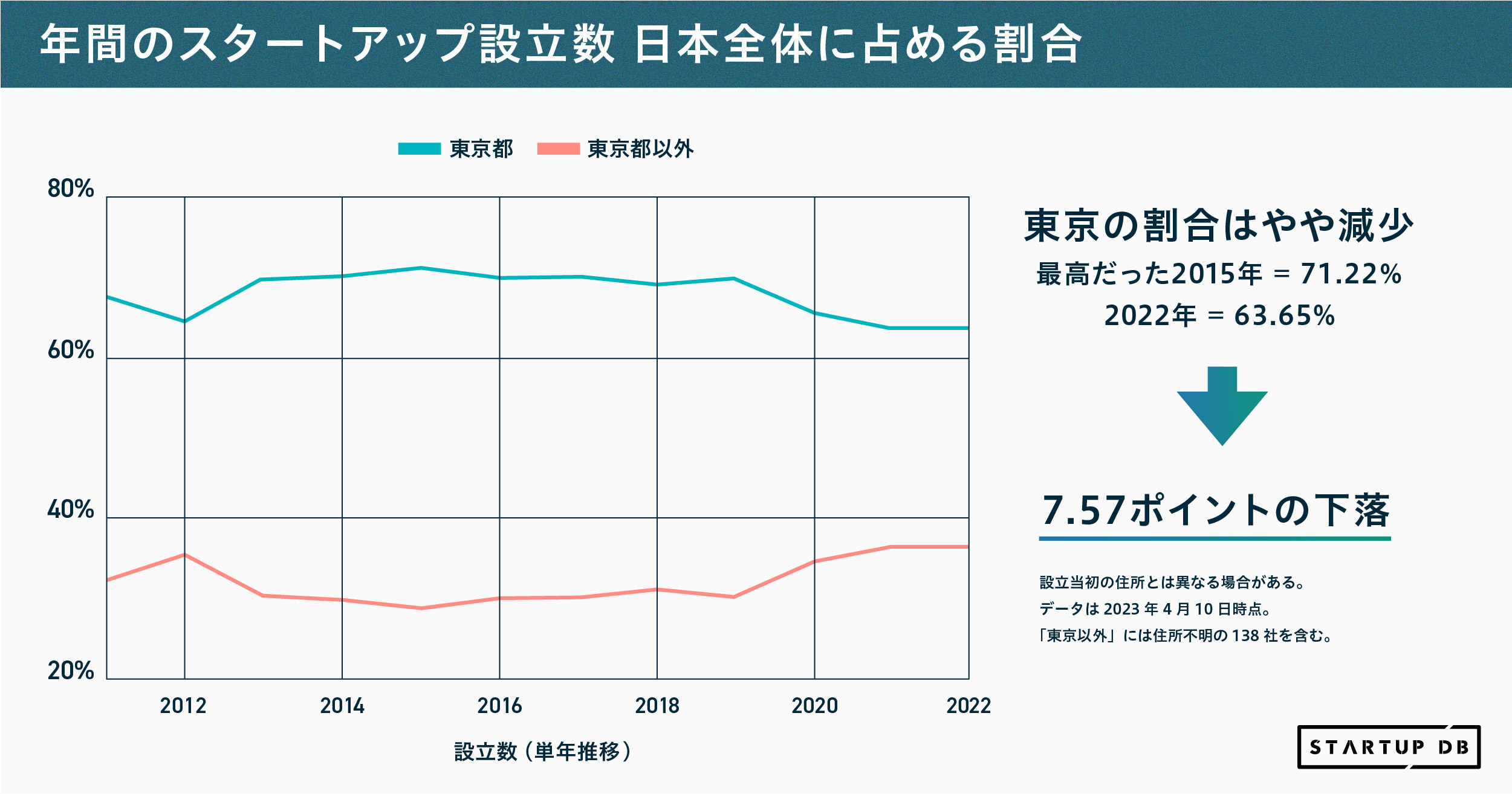 2012年時点では、東京のスタートアップは3,353社で日本全体の61.8%だった。およそ10年間で7,000社近いスタートアップが都内に生まれ、東京の占める割合は増加した。