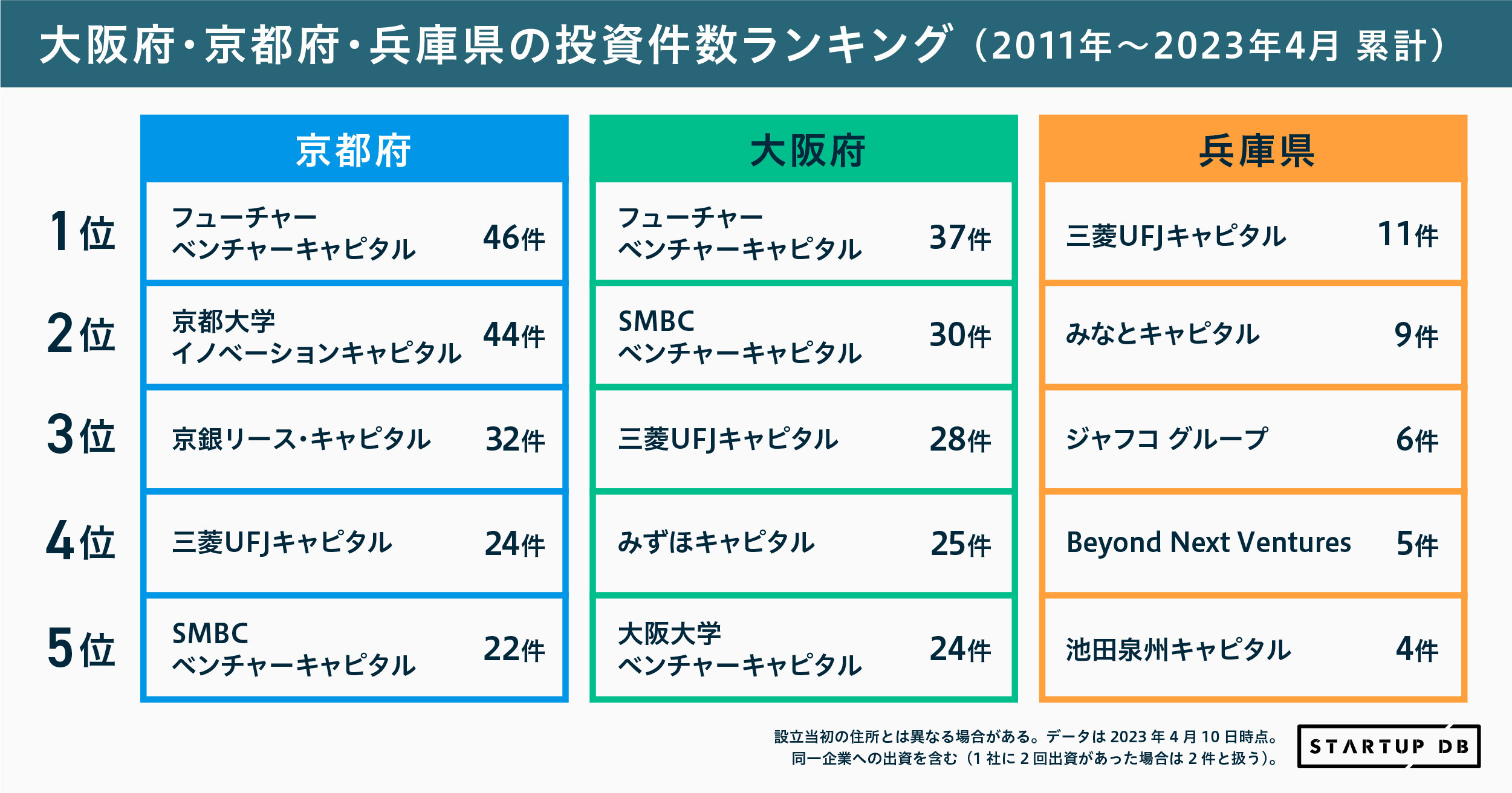 関西圏で積極的な投資活動を展開するのは、京都に本社を置く独立系VCのフューチャーベンチャーキャピタルだ。2011年から23年4月にかけて、大阪府で28件、京都府で39件の投資を実行している。いずれも他の投資家を抑えて地域最多だ。大阪ではSMBCベンチャーキャピタル、京都では京都大学イノベーションキャピタルもそれぞれ存在感を発揮している。