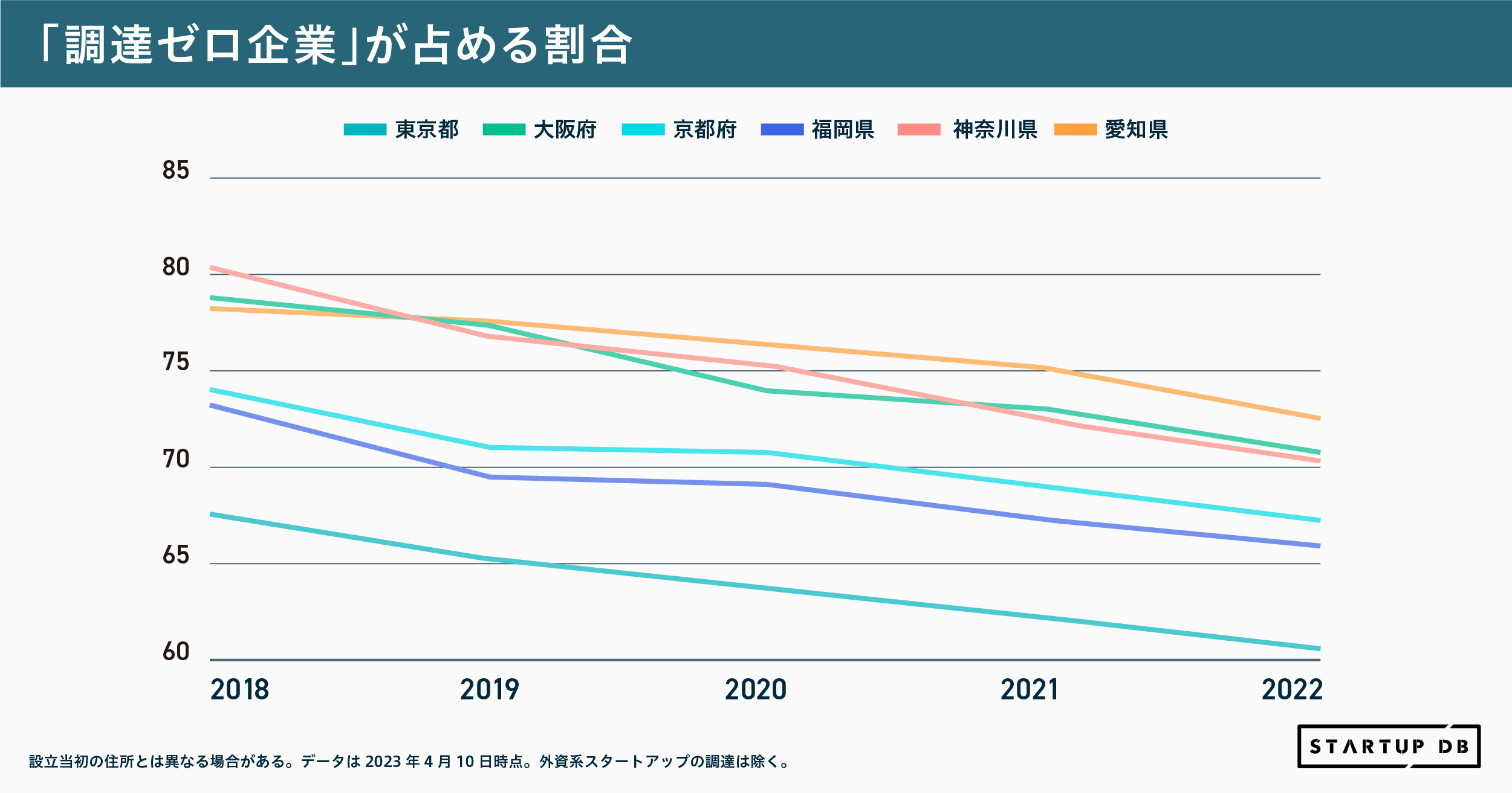 加えて、より広い範囲の地方発スタートアップに成長資金が供給されるようになった可能性もある。注目したいのが「調達実績ゼロ」スタートアップの割合だ。